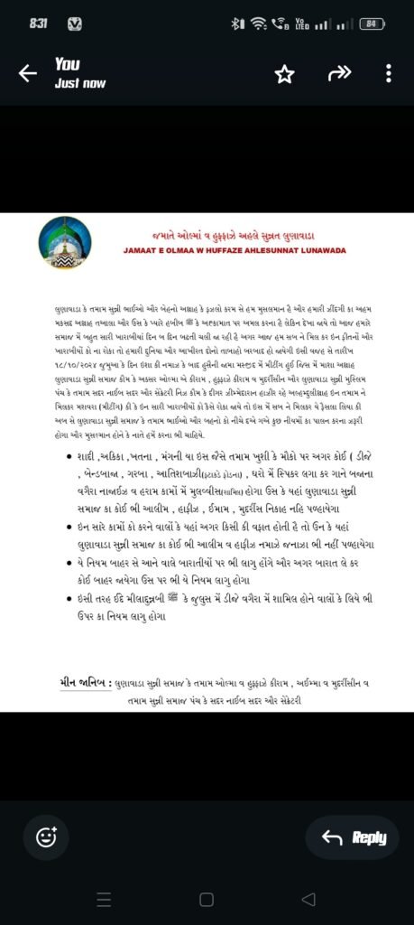 लूनावाड़ा या सभी सुन्नी भाई और बहनो अल्लाह के फजलो करम से हम मुसलमान हैं और हमारी जिंदगी का अहम मकसद अल्लाह ताला और हमारे प्यारे हबीब के अटकामाअत है अमलाना है लेकिन देखा जाए तो आज हमारा समाज दिन-ब-दिन बहुत खराब हो गया है जा रही है अगर आज हम सब ने मिल कर इन फितानो और बर्बादियों को ना रोका तो हमारी दुनिया और आखिरी दोनों बर्बाद हो जाएंगी इसी वजह से दिनांक 18/10/2024 जुमुआ के दिन ईशा की नमाज बाद हुसैनी जामा मस्जिद में थी। एक बैठक जिस में माशा अन्ना लुनवाड़ा सुन्नी समाज कौम के अक्सर ओलमा ए कीरम, हुफ्फाज़े कीरम वा मुदारिसिन और लुनवाड़ा सुन्नी मुस्लिम पंच के सभी सदर नायब सदर और सचिव निज कौम के दीगर ज़िम्मेदारन हाज़िर रह अलहम्दुलिल्लाह इन ऑल ने मिलकार मशवारा (बैठक) की के सारी खराबियों को कैसे रोका जाए तो इस मुख्य सबने मिलकर ये कैसे लिया कि अब से लूनावाड़ा सुन्नी समाज के सभी भाइयों और बहनों को कुछ नियमों का पालन करना होगा और मुस्लिम होने के नाते हमें ना भी चाहिए।