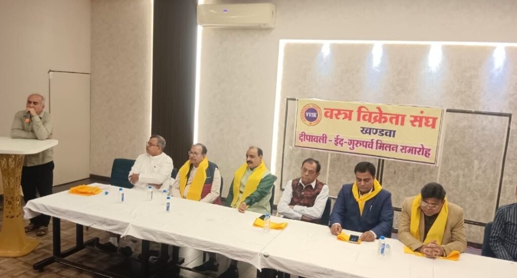 खंडवा।वस्त्र विक्रेता संघ खंडवा का दीपावली ईद गुरु पर्व मिलन समारोह गत रात्रि संपन्न हुआ। चेंबर ऑफ कॉमर्स के पदाधिकारीयों के सानिध्य में मिलन समारोह में आगामी वित्तीय सत्र हेतु शुभकामनाएं दी गई।वस्त्र विक्रेता संघ के उपाध्यक्ष कमल नागपाल और प्रवक्ता मुदित जेटली ने जानकारी देते हुए बताया कि सिविल लाइंस स्थित एक निजी होटल में यह आयोजन रविवार रात्रि संपन्न हुआ।कार्यक्रम के मुख्य अतिथि चेंबर ऑफ कॉमर्स अध्यक्ष सुनील बंसल,विशेष अतिथि चेंबर सचिव संतोष गुप्ता और चेंबर के कोषाध्यक्ष गोवर्धन गोलानी का वस्त्रांबर से स्वागत वस्त्र विक्रेता संघ की ओर से हरमिंदर सिंह छाबड़ा,गणेश गुरबाणी,राजीव शाह,रवि शाह,बशीर मलिक,एम यूनुस,मनोज उधलानी,राजीव बाहेती,मुदित जेटली आदि ने किया।स्वागत उद्बोधन देते हुए अध्यक्ष गणेश गुरबाणी ने अतिथियों का शाब्दिक अभिनंदन किया।कोषाध्यक्ष राजीव बाहेती ने प्रगति प्रतिवेदन प्रस्तुत किया।वर्ष भर में संस्था को हुई आय और व्यय के साथ-साथ विभिन्न गतिविधियों के बारे में जानकारी सभा पटल पर रखी गई।वस्त्र विक्रेता संघ के पूर्व अध्यक्ष राजीव शाह ने अपने उद्बोधन में कहा कि हमारी संस्था सदैव सक्रिय रहती आई है और सभी के सहयोग से सक्रिय बनी रहेगी।आपने कहा कि अमेरिका में डिजिटल लेन देन पचास फीसदी तक पहुंच चुका है।सचिव एम यूनुस ने कहा कि संगठन की गतिविधियों में सभी का सहयोग मिलता रहता है।