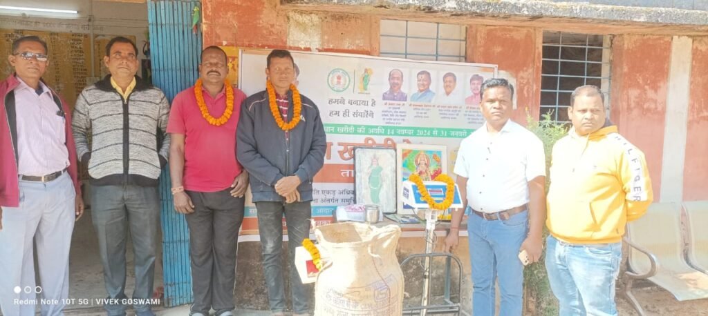 कोरबा/छत्तीसगढ़/:_पोड़ी उपरोड़ा विकास खंड अंतर्गत ग्राम पंचायत तानाखार में 26/11/24 दिन मंगलवार को सुबह 11बजे भारत माता, छत्तीशगढ़ महतारी की पूजा अर्चना कर श्री फल फोड़ कर सुभारम्भ किया गया जिसमें मुख्य अतिथि के रूप में श्री राकेश कुमार कंवर तानाखार सरपंच और केंद्र संचालक संतन दास महंत, एवं केंद्र के कर्मचारी और हमाल, किसान भाई उपस्थित रहे।