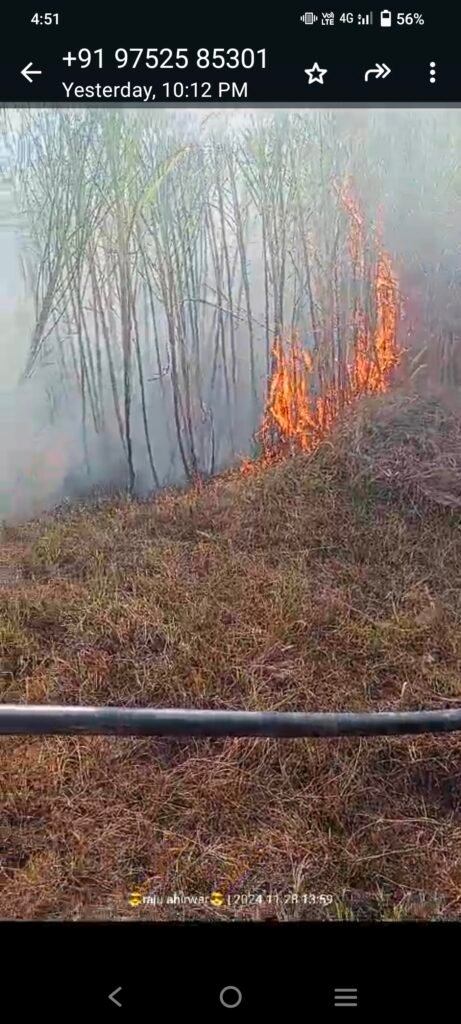 रिपोर्ट, रामकुमार तिवारी रायसेन। रायसेन जिले केदेवरी तहसील के अंतर्गत आने वाले ग्राम पंचायत पताई में स्थानीय किसान श्री रविकांत जी दुबे के गन्ने के खेत में मंगलवार रात्रि एक बजे के लगभग आग लग गई। देखते ही देखते आग ने इतना वो इतना विक्राल रूप ले लिया कि आग पर काबू पाना मुश्किल हो गया और लगभग चालीस एकड़ की गन्ने की फसल को अपनी चपेट में ले लिया।चालीस एकड़ की गन्ने की फसल जल कर खाक हो गई।चार बजे तक काबू पाने में असफल रहे। दो तीन घंटे में ग्रामीण क्षेत्रों से एकत्रित होकर असफल प्रयास करते रहे लेकिन प्रशासन की तरफ से दमकल आदि की कोई व्यवस्था नहीं की गई।किसान का लाखों की फसल जल कर राख हो गई।आग ने इतना भयंकर रूप लिया और किसान का सिंघाई का सामान पाइप नोजल मोटर पंप आदि भी जल कर नष्ट हो गए।यदि समय रहते प्रशासन जाग जाता तो कुछ हद तक आग पर काबू पाया जा सकता था।आग का कारण बिजली का शार्क सर्किट बताया जा रहा है।