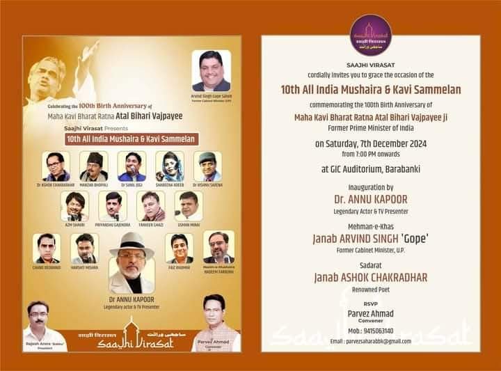 बाराबंकी में “साझी विरासत” के तत्वावधान में 10वां ऑल इंडिया मुशायरा और कवि सम्मेलन का आयोजन किया जा रहा है। यह विशेष कार्यक्रम भारत रत्न एवं पूर्व प्रधानमंत्री अटल बिहारी वाजपेयी जी की 100वीं जयंती को समर्पित है।