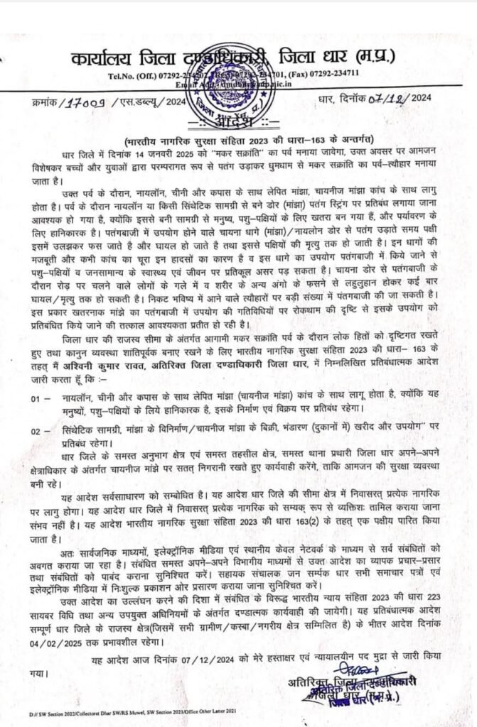 नायलोन अथवा सिंथेटिक सामग्री से बनी डोर पतंग स्टिक के बिक्री पर प्रतिबंध्य लगने के लिए जिला प्रशासन ने जारी किया निर्देश