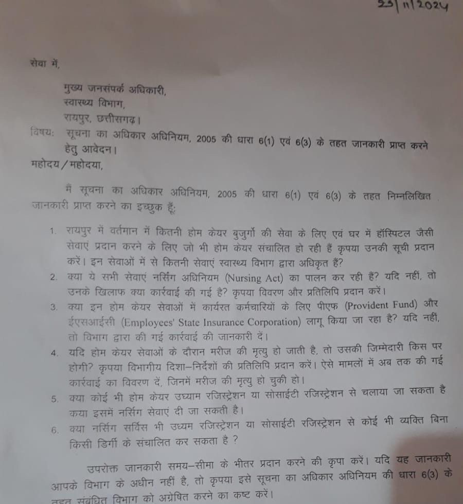 रायपुर में संचालित नर्सिंग केयर सेवाओं को लेकर कई गंभीर सवाल उठाए गए हैं। इन सेवाओं के संचालन और उनकी वैधता पर स्थानीय स्तर पर चिंताएं बढ़ रही हैं। स्वास्थ्य विभाग को सूचना के अधिकार के तहत एक आवेदन देकर इन सेवाओं से संबंधित जानकारियां मांगी गई हैं।