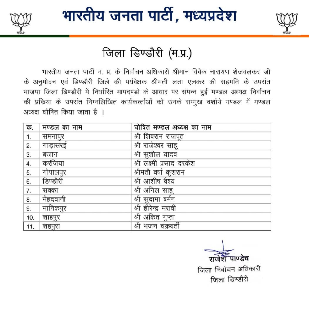 भाजपा संगठन पर्व-2024 के तहत डिंडौरी एवं झाबुआ जिले में सम्पन्न भाजपा मण्डल अध्यक्ष निर्वाचन प्रक्रिया के उपरान्त निम्नलिखित मण्डल अध्यक्ष सर्व सम्मति से नियुक्त किए जाते हैं