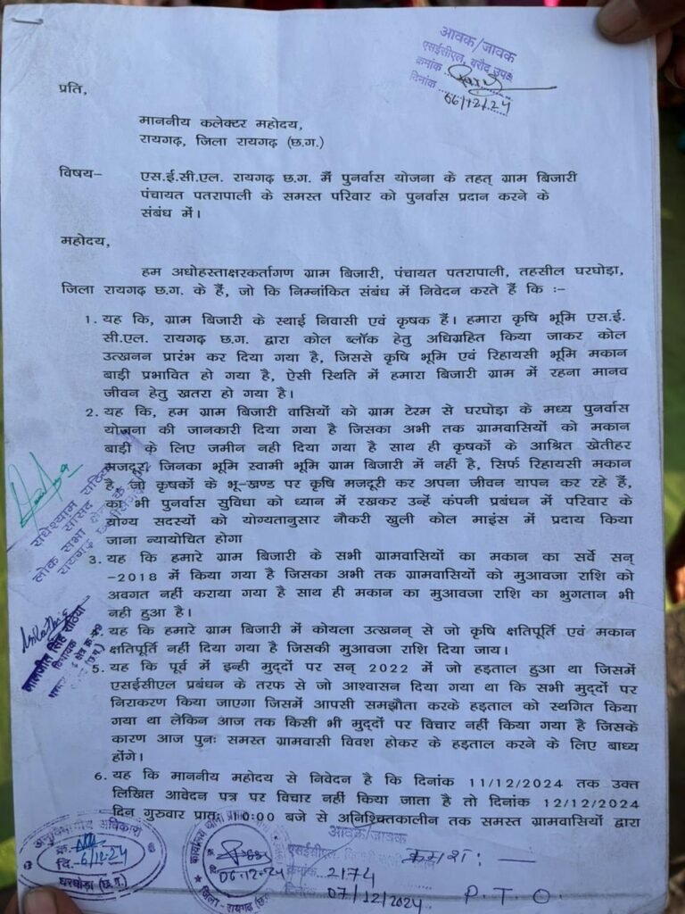 रायगढ़। जिले के घरघोड़ा क्षेत्र में स्थित एसईसीएल (साउथ ईस्टर्न कोलफील्ड्स लिमिटेड) की बिजारी खुली खदान के खिलाफ ग्रामीणों ने मोर्चा खोल दिया है।