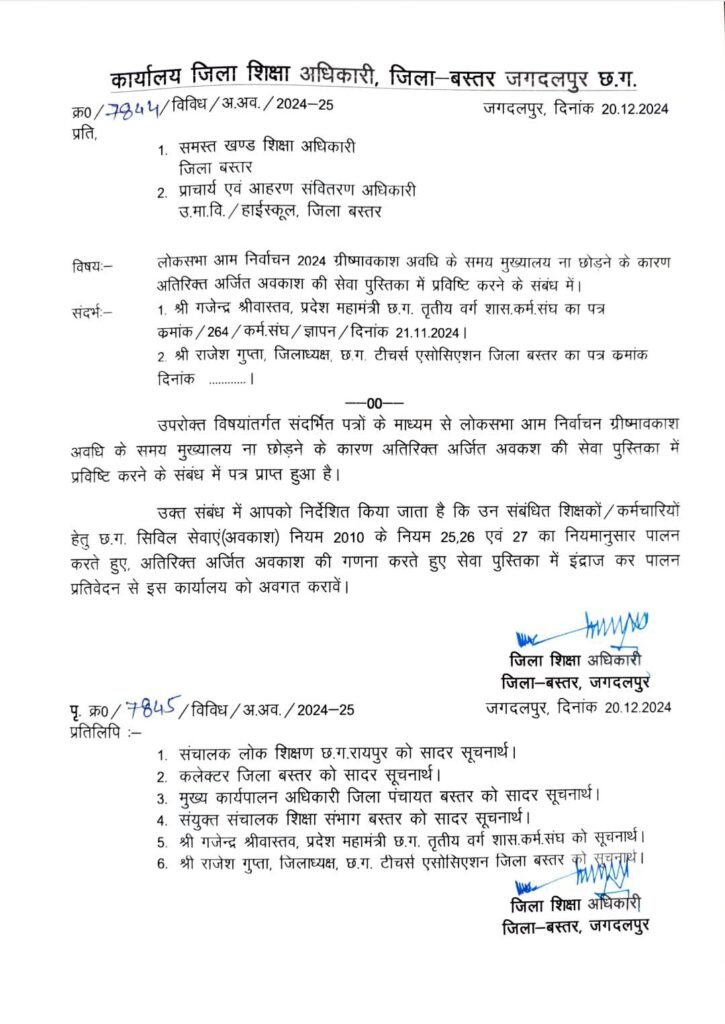 जिला शिक्षा अधिकारी बलीराम बघेल के हस्ताक्षर से एक पत्र जारी किया गया है जिसमें खंड शिक्षा अधिकारी तथा प्राचार्य व आहरण वितरण अधिकारी को महामंत्री गजेन्द्र श्रीवास्तव व राजेश गुप्ता के पत्र के संदर्भित पत्रानुसार कहा है कि लोकसभा आम निर्वाचन ग्रीष्मावकाश अवधि के समय मुख्यालय ना छोड़ने के कारण अतिरिक्त अर्जित अवकश की सेवा पुस्तिका में प्रविष्टि करने के संबंध में पत्र प्राप्त हुआ है।