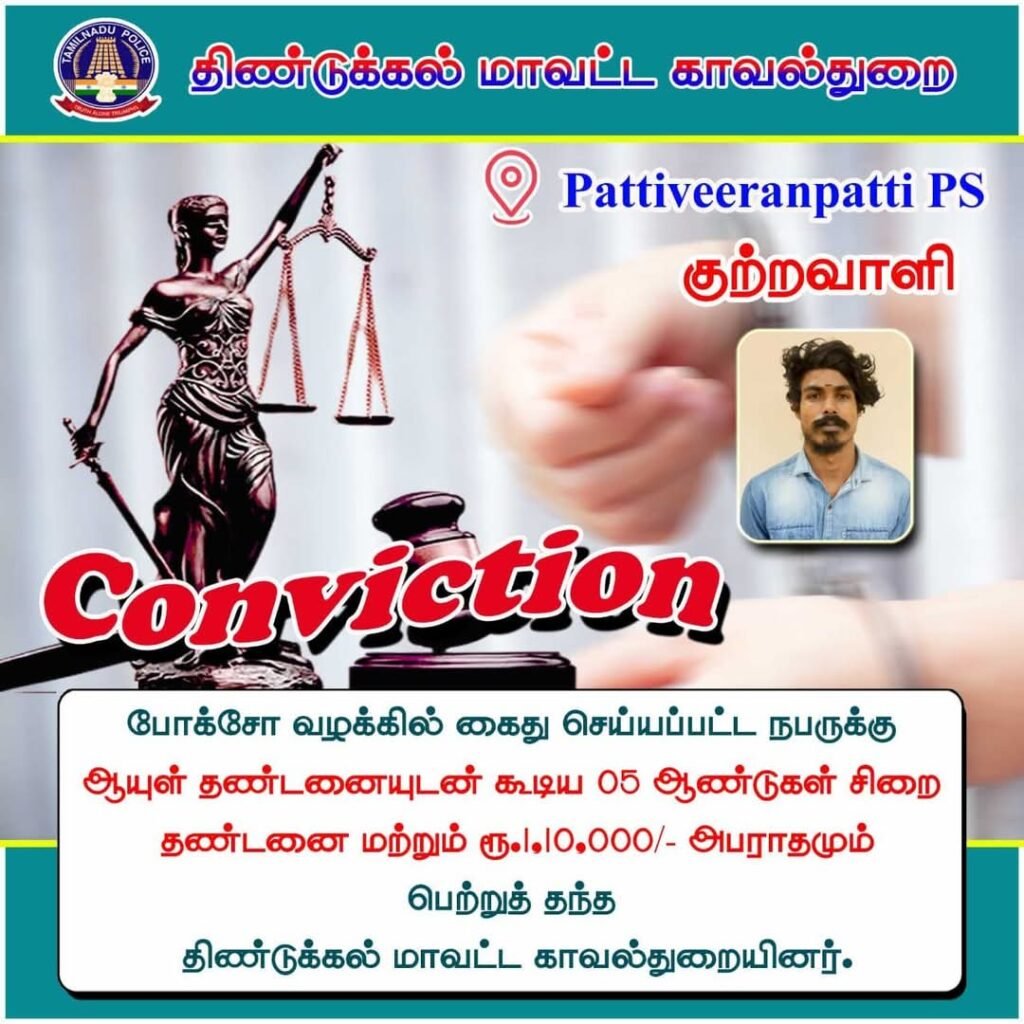 இந்நிலையில் இவ்வழக்கு திண்டுக்கல் சிறப்பு போக்சோ நீதிமன்றத்தில் நடைபெற்று வந்த நிலையில் திண்டுக்கல் மாவட்ட காவல் கண்காணிப்பாளர் மருத்துவர் அ.பிரதீப், இ.கா.ப அறிவுறுத்தலின்படி பட்டிவீரன்பட்டி காவல் நிலைய ஆய்வாளர் ராஜசேகரன்,நீதிமன்ற தலைமை காவலர் நாகலட்சுமி மற்றும் அரசு வழக்கறிஞர் மைதிலி ஆகியோரின் சீரிய முயற்சியால் (26.12.2024) இன்று திண்டுக்கல் சிறப்பு போக்சோ நீதிமன்ற நீதிபதி குற்றவாளி பூமணிக்கு ஆயுள் தண்டனையுடன் கூடிய 05 ஆண்டுகள் தண்டனை மற்றும் ரூ.1,10,000/- அபராதமும் விதித்து தீர்ப்பு வழங்கினார்.
