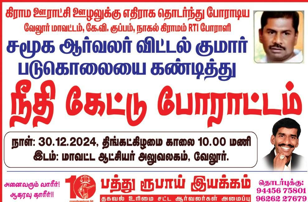 சமூக ஆர்வலர் விட்டல் குமார் படுகொலையை கண்டித்து நீதி கேட்கும் போராட்டம் வேலூர் மாவட்ட ஆட்சியர் அலுவலகம் எதிரில் பத்து ரூபாய் இயக்கத்தின் சார்பில் ஆர்ப்பாட்டம் நடைபெற்றது… ஆர்ப்பாட்டத்திற்கு காவலர் அனுமதி மறுக்கப்பட்டதால் மாவட்ட ஆட்சியர் மற்றும் மாவட்ட காவல் கண்காணிப்பாளரரிடம் கோரிக்கை மனு அளிக்கப்பட்டது…அதனைத் தொடர்ந்து வரும் மூன்றாம் தேதி சென்னையில் உள்ள டிஜிபி அலுவலகத்தை முற்றுகையிட்டு போராட்டம் நடத்தப் போவதாக பத்து ரூபாய் இயக்கத்தின் பொதுச்செயலாளர் நல்வினை விசுவராஜ் தெரிவித்தார்.போராட்டத்தில் பத்து ரூபாய் இயக்கத்தின் நிறுவனரும்,பொதுச் செயலாளரருமான நல்வினை விஸ்வராஜ்,துணைப் பொதுச் செயலர் தர்மேந்திரன்,வேலூர் மாவட்ட அமைப்பாளர் வேல்முருகன்,திருப்பத்தூர் மாவட்ட அமைப்பாளர்