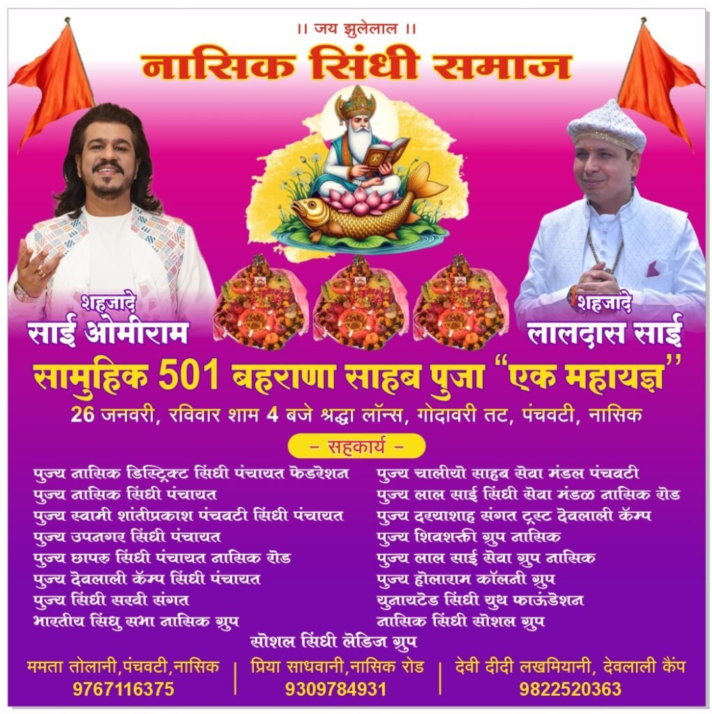 नासिक-नासिक कुंभ नगरी में पहली बार नासिक सिंधी समाज की ओर से 501 पूज्य बहराना साहब पूजा का महायज्ञ 26 जनवरी 2025,रविवार के दिन शाम 4 बजे , नासिक के पंचवटी में श्रध्दा लान्स गोदावरी तट पर होने जा रहा है,इस महायज्ञ में भाग लेने के लिए अपना नाम जल्द से जल्द लिखवाए।