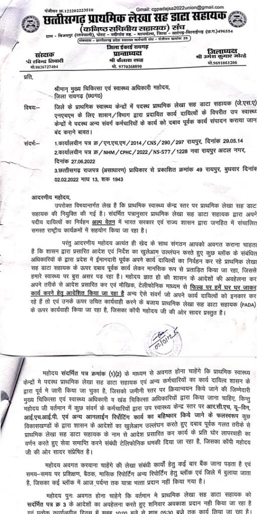 छत्तीसगढ़ प्राथमिक लेखा सह डाटा सहायक-कनिष्ठ सचिवीय संघ, अपनी समस्याओं एवं मांगो को लेकर, अपनी कार्यस्थल पर होनी वाली समस्याओं के संबंध मे मुख्य चिकित्सा एवं स्वास्थ्य अधिकारी जिला रायगढ़ तथा जिला कार्यक्रम प्रबंधक-एन.एच.एम. को अवगत कराया गया,