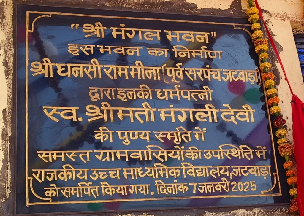 मंडावर उपखंड क्षेत्र की ग्राम पंचायत जटवाड़ा में राजकीय उच्च माध्यमिक विद्यालय जटवाड़ा के पूर्व सरपंच धंसीराम मीणा ने अपनी धर्म पत्नी स्वर्गीय मंगली देवी की स्मृति में विद्यालय परिसर में एक हाल का निर्माण कराया गया जिसकी लंबाई 62 फुट चौड़ाई 32 फुट हॉल का निर्माण विद्यालय परिसर में करवाया। जिसका मंगलवार को स्थानीय विद्यालय के प्रधानाचार्य राकेश मीणा एवं पूर्व सरपंच धंसीराम राम मीणा द्वारा फीता काट कर उदघाटन किया गया।। इस दौरान ग्रामवासियो ने एकजुटता से शिक्षा के क्षेत्र में आगे भी बढ़कर सहयोग करने निर्णय लिया। वही कैलाश चन्द मीना प्रधान मुख्य वनसंरक्षक निवासी जटवाड़ा द्वारा सभी बच्चों (280) को बैठने के लिए फर्नीचर उपलब्ध करवाने की घोषणा की।