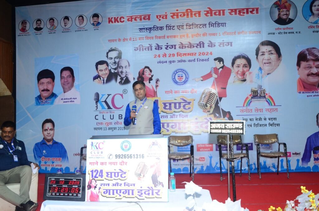 खंडवा।। वर्ल्ड रिकॉर्ड के लिए केकेसी क्लब एवं संगीत सेवा सहारा के यूनाइटेड अनेजुएट मे एडोरो के अभिनव कला समाज सभागार मे 124 समकालीन सतत गायन के कार्यक्रम पिछले नए दिनों का आयोजन हुआ, आयोजित कार्यक्रम का शुभम्भ एम.पी.आर. विश्व प्रसिद्ध प्ले बेक गायक मोहम्मद रफी के सुपुत्र शाहिद रफी ने के. संग्रहालय और किशोर सांस्कृतिक प्रेरणा मंच के प्रवक्ता सुनील जैन ने बताया कि इस समारोह में इंदौर खंडवा सहित अन्य गायक कलाकार इंदौर आए और कुछ अपने घर बैठे ऑफ़लाइन के माध्यम से भी शामिल हुए। इस कीर्तिमान कार्यक्रम का आयोजन किशोर दा की नगरी खंडवा में भी किया गया, जिसमें गायक कलाकार संजय पूर्व, नरेश बलवानी, स्प्रिंग हेमवानी, हरीश रेवतानी, रामदुलारे शर्मा ने आशिक की आत्माएं दी, केसीसी क्लब द्वारा पूर्व खंडवा के गांधी भवन में भी 48 घंटे के शानदार कलाकार शामिल थे। एक रिकॉर्ड बनाया गया था, जिसमें गायन के कार्यक्रमों में अर्जिस्ट ने कहा था कि इंदौर और खंडवा में महान गायकों का जन्म और कर्म स्थली हो रही है। 129 कलाकारों में कुल 530 कलाकार शामिल हुए और लगभग 2000 गीत कराओके ट्रैक सुनाए गए, 129 कलाकारों में से 129 कलाकारों ने विश्व कीर्तिमान का निर्माण किया।