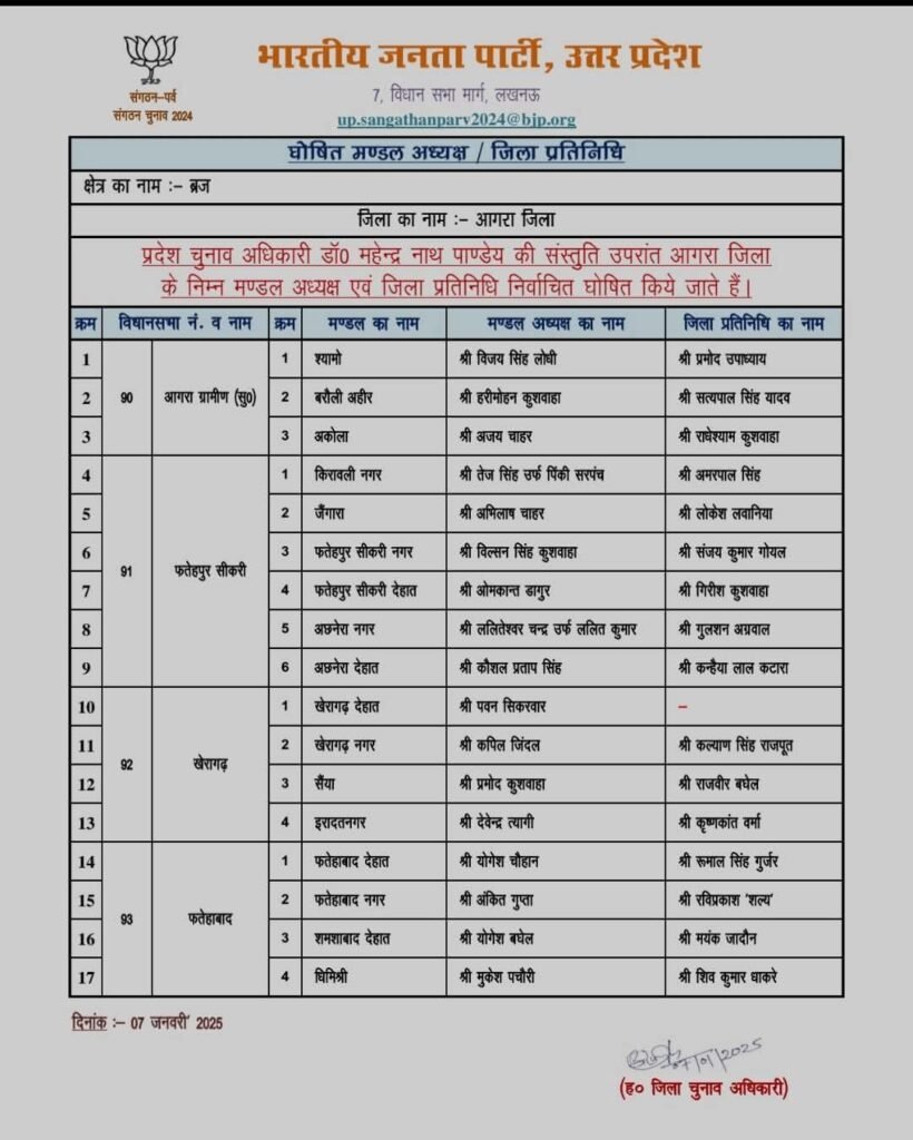 जनपद आगरा में मंडल अध्यक्ष एवं जिला प्रतिनिधि के नाम की घोषणा कर दी गई है।