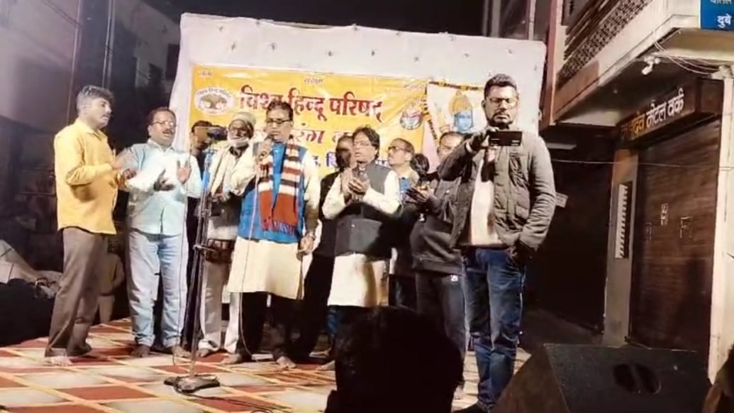 खण्डवा-भगवान श्री राम की प्राण-प्रतिष्ठा के प्रथम वर्षगांठ पर नगर के पद्मकुण्ड वार्ड में भावसार लॉज के नज़दीक एक विशाल भजन संध्या का आयोजन विश्व हिन्दू परिषद एवम बजरंग दल व्दारा हूआं श्री रविन्द्र शेंडगे (छोटू मंत्री ) ने बताया श्री काकाजी म्यूज़िकल ग्रुप खण्डवा के स्थानीय सुर साधको के माध्यम से आयोजित किया जिसमे ग्रुप के वरिष्ठ भजन गायक शंकर मित्रा ने गणेश वंदना के साथ ही श्री राम के क्लासिकल भजनों से अपनी प्रस्तुति देकर धर्म प्रेमी जनता का मन मोह लिया । हारमोनियम शंकर मित्रा, औऱ तबले पर जिले के वरिष्ठ तबला वादक नत्थू विश्वकर्मा ने संगत की । अन्य कलाकारों में धरमचन्द सोनी, भैयालाल बाकोरे, गणेश शिंदे, अनिल गौर, जितेंद्र मण्डवाल, अनिल नागनपुरिया, मनीष नरवाले, संजय नरवाले, बबलू मालवीय, पी के मालवीय एवम विष्णु मगरे ने अपनी अपनी भजनों की प्रस्तुति देकर दर्शको का मन मोह लिया।कार्यक्रम के प्रमुख आयोजक राजू पटेल ने “” मैली चादर ओढ़ के कैसे द्वार तिहारे आऊं “” भजन गा कर समां बांध दिया जो दर्शकों को बहु पसंद आया।कार्यक्रम के अंत मे समापन अवसर पर धरमचंद सोनी ने ग्रुप के समस्त सदस्यों के साथ हनुमान चालीसा का पाठ किया तत-पश्च्यात प्रसादी का वितरण हुआ ।