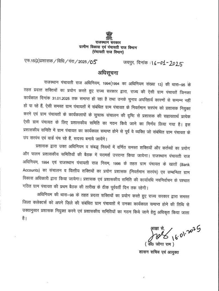 राजस्थान में सरपंचों के कार्यकाल को लेकर बड़ा फैसला, सरकार ने जारी किए आदेश, एमपी मॉडल के तहत बढ़ेगा सरपंचों का कार्यकाल, पहले ही दे चुका कार्यकाल बढ़ने के संकेत, अब “वन स्टेट, वन इलेक्शन” का मार्ग हुआ प्रशस्त राजस्थान