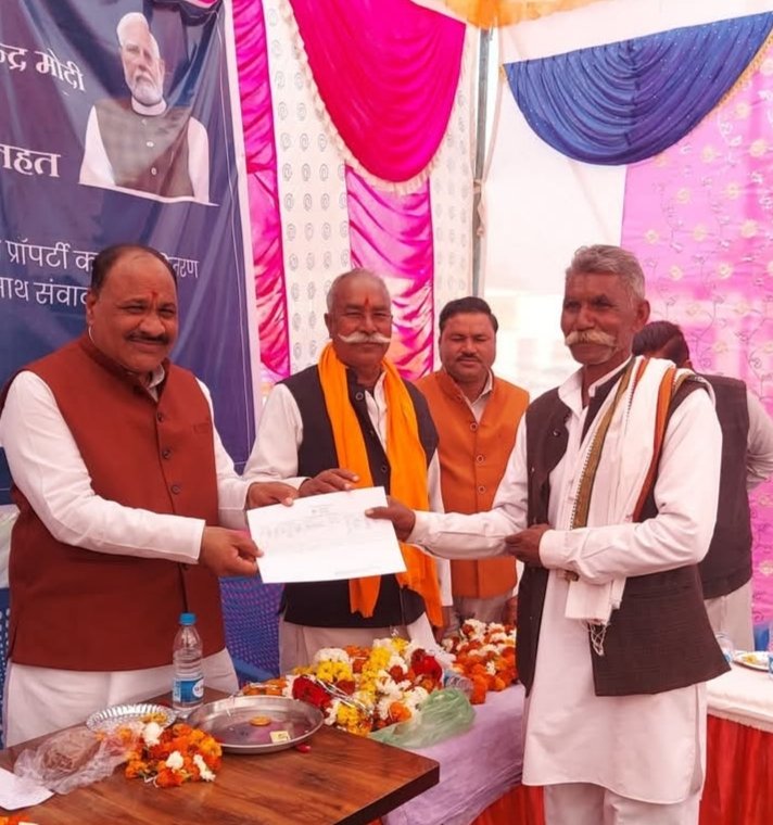 शिवपुरी। कोलारस 27 से विधायक महेंद्र सिंह यादव के पट्टा वितरण एवं भूमि पूजन कार्यक्रम मै शामिल हुए होकर ग्रामीणों को पट्टे वितरित किए और हाईस्कूल का भूमिपूजन किया प्रधानमंत्री श्नरेंद्र मोदी के नेतृत्व में स्वामित्व योजना के तहत ऐतिहासिक कार्यक्रम आयोजित किया गया। इस अवसर पर देशभर के 50,000 से अधिक गांवों में 65 लाख प्रॉपर्टी कार्ड वितरित किए गए और लाभार्थियों से संवाद किया गया।