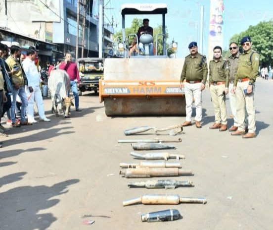 शहर मै मोटर साइकिलों में लगे तेज साउंड वाले सायलेंसर को जप्त कर रोड़ रोलर से नष्ट कराए गए