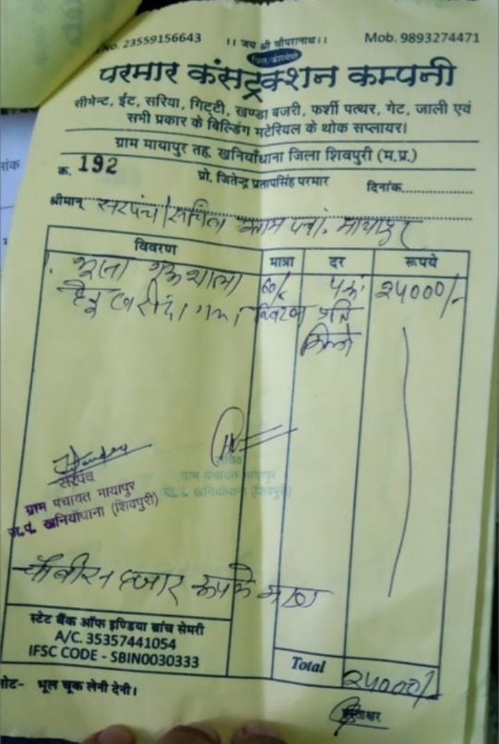 सरपंच सचिव ने पंचायत में पंच परमेश्वर योजना के तहत भूसा की खरीददारी हुई जिसमें सीमेंट ईट गिट्टी के सरिया पर भूसा का बिल बना के लगा दिया और उसका पेमेंट भी क्लीयर हो गया आखिरकार शासन प्रशासन की मिली भगत है क्योंकि अंधे को भी दिख जाएगा कि बिल किस चीज का है आखिरकार परमार कंटरक्शन कंपनी के बिल जिसमें ईट गिट्टी सरिया सीमेंट थोक सप्लायर है भूसा के सप्लायर है समझ से परे है आखिरकार इतना अंधापन कब तक चलेगा