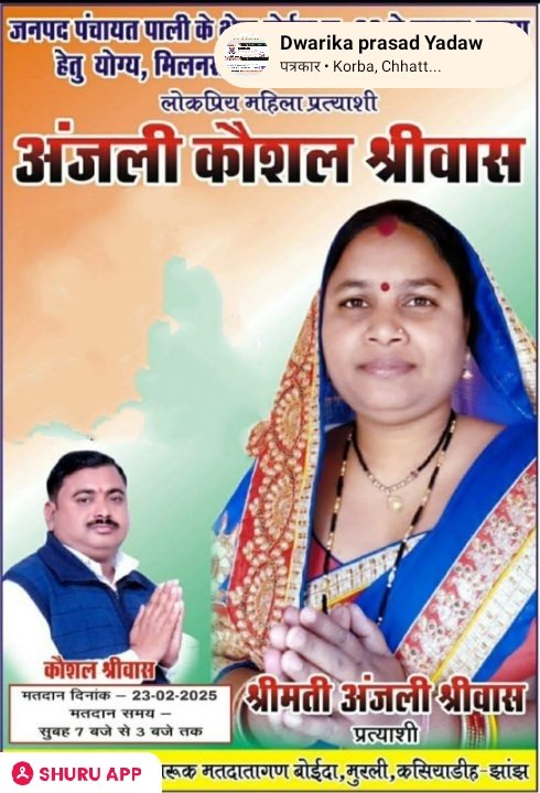 पाली / हरदीबाजार क्षेत्र में चुनाव नजदीक आते ही गावों में हर प्रत्याशी अपने अपने समर्थकों के साथ जनता का राय ले रहा है , इसी कड़ी में जनपद पंचायत पाली के क्षेत्र क्रमांक 8 से भावी प्रत्याशी अंजली कौशल श्रीवास को जनता का पुरा समर्थन और आशीर्वाद मिल रहा है । पूर्व में भी कौशल श्रीवास जनपद सदस्य का कमान क्षेत्र में विकास के साथ ग्रामीण क्षेत्रों में अपना अलग पहचान बना चुका है ।और अंजली श्रीवास भी एक जनपद पंचायत पाली के सदस्य रह चुकी है , किसान के घर में जीवन यापन कर महिलाओ को अच्छी मार्ग दर्शन दे रही है , जिसमें बोईदा , कसियाडीह , मुरली के जनता का पुरा समर्थन और आशीर्वाद मिल रहा है । कोरबा से