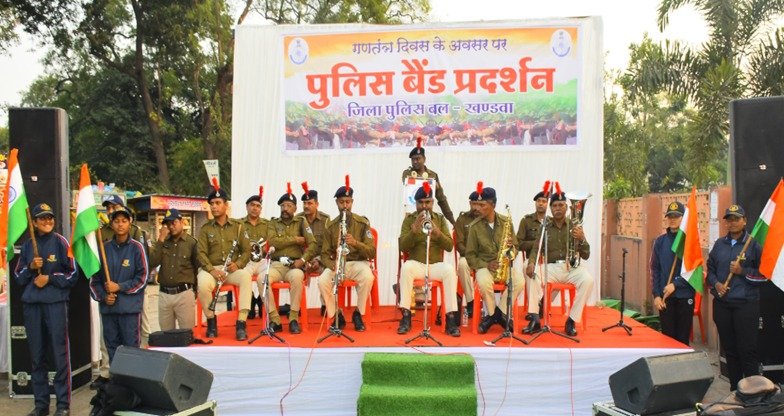 खंडवा,दिनांक 25.01.25 को राष्ट्रीय पर्व गणतंत्र दिवस की पूर्व संध्या पर खंडवा पुलिस के तत्वाधान मे जिला मुख्यालय खंडवा के इंद्रा चौक में खंडवा पुलिस बैंड द्वारा देशभक्ति एवं मधुर गीतों की विशेष प्रस्तुति बैंड एवं वाद्य यंत्रों के द्वारा दी गई।कार्यक्रम मे पुलिस बैण्ड की प्रस्तुति के दौरान इंद्रा चौक खंडवा में कलेक्टर खंडवा श्री अनूप कुमार सिंह, पुलिस अधीक्षक खंडवा श्री मनोज कुमार राय अतिरिक्त पुलिस अधीक्षक (शहर) श्री महेंद्र तारणेकर, अतिरिक्त पुलिस अधीक्षक (ग्रामीण) श्री राजेश रघुवंशी, एसडीएम खंडवा श्री बजरंग बहादुर, नगर पुलिस अधीक्षक श्री अभिनव बारंगे, उप पुलिस अधीक्षक मुख्यालय श्री अनिल सिंह चौहान, उप पुलिस अधीक्षक यातायात श्री आनंद स्वरूप सोनी, एनसीसी कैडेट्स, स्कूली बच्चे व समस्त थानों के थाना प्रभारी एवं चौकी प्रभारी सहित पुलिस अधिकारी व कर्मचारीगण, पत्रकारगण, गणमान्य नागरिक तथा आमजन करीब 400 की संख्या मे उपस्थित रहे।