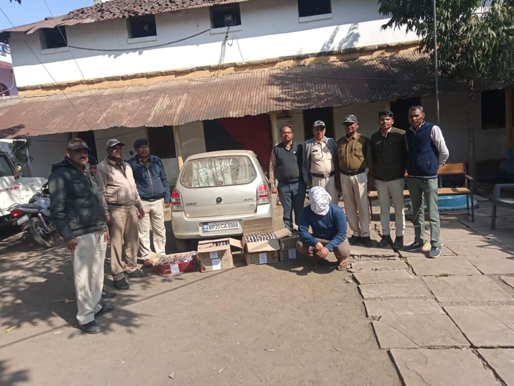 कलेक्टर हर्ष सिंह द्वारा जिले में अवैध शराब के संग्रहण परिवहन एवं विक्रय पर कार्यवाही हेतु निर्देशित किया गया है। उक्त निर्देशानुसार शुक्रवार रात्रि 10 से 11 बजे के बीच जबलपुर की तरफ से एक सिल्वर रंग की अल्टो कार क्रमांक एम.पी.-20 सी.ए 6988 से अवैध विक्रय हेतु लाया जा रहा था, जिसे मुखबिर की सूचना के आधार पर अवैध शराब पकड़ने हेतु सम्हर सिंह धुर्वे आबकारी उपनिरीक्षक शहपुरा के नेतृत्व में टीम गठित कर रवाना किया गया। टीम द्वारा रात्रि 11 बजकर 20 मिनट पर प्रभु ढावा व रेस्टारेंट के सामने जबलपुर-शहपुरा मेन रोड कोहानी देवरी थाना शहपुरा में उक्त वाहन को घेराबंदी कर रोका गया। साक्षियों की उपस्थिति में पूछताछ करने पर कार में सवार व्यक्ति का नाम व पता पूछने पर दीपांशु पिता कमलेश शिवहरे निवासी बिछिया थाना शहपुरा बताया गया। कार की तलाशी लेने पर कार की बीच की सीट में कागज के कार्टून में 3 पेटी जीनियस रम एवं डिक्की में 3 पेटी जीनियस रम व एक पेटी मेकडावल रम कुल 7 पेटी (कुल 348 पाव) मात्रा 62.64 बल्क लीटर विदेशी मदिरा बरामद किया गया। जिसकी अनुमानित कीमत 48660 रुपये है। मौके पर अवैध शराब परिवहन/ धारण के संबंध में वैध पास परमिट मांगे जाने पर प्रस्तुत नहीं किया गया। आरोपी द्वारा उक्त कृत्य मध्यप्रदेश आबकारी अधिनियम 1915 संशोधित 2000 की धारा 34(1) क (2) एवं 46 (1) के तहत दण्डनीय अपराध पाये जाने पर प्रकरण क्रमांक 233/25 दिनांक 25.01.2025 पंजीबद्ध किया गया है। अवैध शराब का परिवहन पाये जाने पर शराब एवं आल्टो कार अनुमानित कीमत 100000/- को जप्त कर आरोपी को गिरफ्तार कर प्रकरण विवेचना में लिया गया है।