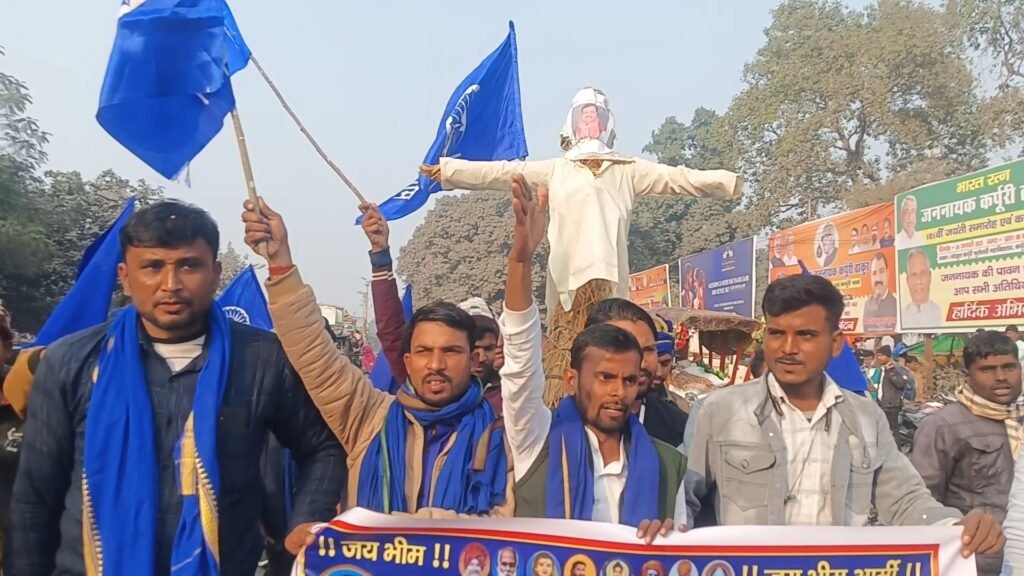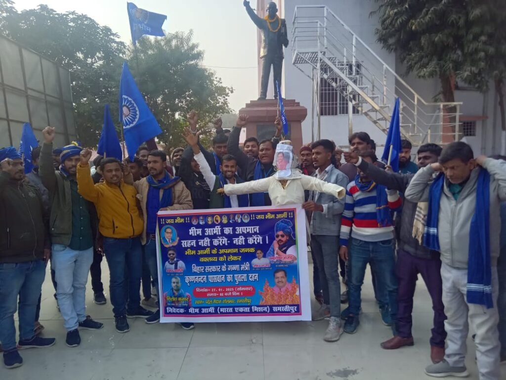 मस्तीपुर। भीम आर्मी भारत एकता मिशन के प्रदेश संगठन द्वारा बिहार सरकार के गणना मंत्री कृष्णनंदन प्रसाद द्वारा दिनांक 24 जनवरी 2025 को भीम आर्मी के संबंध में आपत्तिजनक ब्यान देने पर उनसे माफी मंगवाने एवं अपना ब्यान वापस लेने के लिए ज्ञापन सौंपने का आदेश प्राप्त हुआ। इसी क्रम में भीम आर्मी भारत एकता मिशन समस्तीपुर की ओर से जिलाधिकारी को आज ज्ञापन दिया गया। अगर गन्ना मंत्री द्वारा अपना ब्यान वापस नहीं लिया तथा माफी नहीं मांगे तो जन आंदोलन सड़क से सदन तक जारी रहेगा। इसी के मद्दे नजर भीम आर्मी भारत एकता मिशन के लोगों ने गन्ना मंत्री का जमकर विरोध जताया तथा शहर के गोलंबर के पास पुतला दहन किया। विरोध प्रदर्शन करने वालों में भीम आर्मी के जिला अध्यक्ष डॉ निलेश कुमार, युवा आजाद समाज पार्टी के जिला अध्यक्ष मो एनामुल हक, मो तहसीन, इंद्र प्रसाद राम, उपेन्द्र राम, राहुल रोशन, शांतनु पासवान, रंजित मल्लिक, सत्येंद्र कुमार, तरुण कुमार, राज कुमार राम, सरोज कुमार राम, सुजीत सुजीत राम, मदन राम, राजा राम पासवान, नीरज कुमार, बैद्यनाथ सहनी, उचित राम आदि का नाम शामिल है।