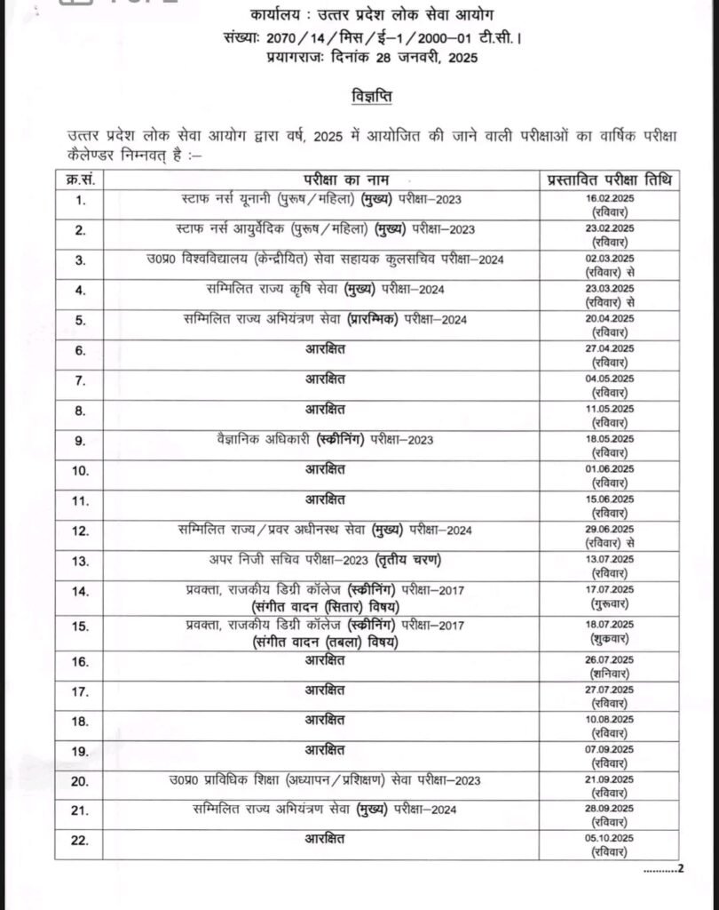 The UPPSC exam calendar 2025, which includes exams for staff nurse, lecturer, Combined State Engineering Service, and Combined State/Senior Subordinate Services positions, has been made public by the Uttar Pradesh Public Service Commission (UPPSC).