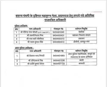 7 more IPS of other districts have been sent to handle security arrangements of Mahakumbh on the main bathing day on Basant Panchami. They include Deoria SP Deependra Nath Choudhary, Anti-Corruption Bureau (ACB) officials Laxmi Niwas Mishra and Rajdhari Chaurasia, and Kanpur DCP Shravan Kumar Singh. On the other hand, ADG Law and Order Vikas Chandra Tripathi, ASP Basti Omprakash Singh, ASP Shravasti Praveen Kumar Yadav are included.