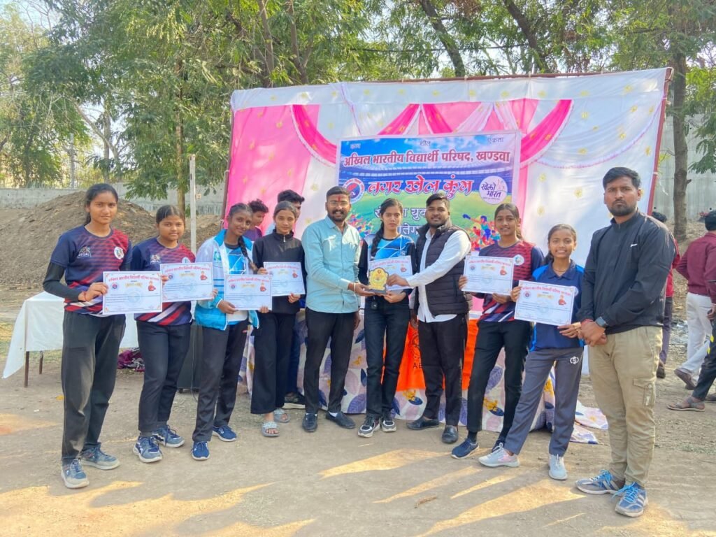 अखिल भारतीय विद्यार्थी परिषद खंडवा के नगर मंत्री अजय बंजारे ने बताया कि नगर खेल कुंभ पूरे देश भर में विद्यार्थी परिषद द्वारा मनाया जा रहा है इसी के निमित खंडवा नगर में भी नगर खेल कुंभ के अर्न्तगत वॉलीबॉल प्रतियोगिता का आयोजन पुलिस लाइन ग्राउंड पर किया गया इसमें मुख्य रूप से नगर पुलिस अधीक्षक श्री अभिनव बारंगे, अभाविप के विभाग संगठन मंत्री श्री सत्यम वर्मा एवं जिला संयोजक हर्ष वर्मा ने विद्या की देवी मां सरस्वती एवं युवाओं के मार्गदर्शक स्वामी विवेकानन्द जी की तस्वीर के समक्ष दीप प्रज्ज्वलित कर कार्यक्रम का विधिवत शुभारंभ किया इसके पश्चात अतिथियों का पुष्पगुच्छ एवं स्मृति चिन्ह भेंट कर स्वागत किया गया इसके बाद अतिथियों ने खिलाड़ियों का उत्साहवर्धन करते हुए वॉलीबॉल प्रतियोगिता प्रारंभ करवाई जिसमे 10 टीमों ने भाग लिया और सभी खिलाड़ियों ने पूरी ईमानदारी और जोश के साथ अपना अच्छा प्रदर्शन किया जिसमे प्रथम स्थान पर पुलिस लाइन ग्राउंड , द्वितीय स्थान पर सेंट जोसफ कान्वेंट स्कूल एवं तृतीय स्थान पर बेंस पब्लिक स्कूल की टीम रही विजेता टीम को मेडल,प्रमाण पत्र एवं स्मृति चिन्ह देकर सम्मानित किया गया एवं प्रतियोगिता में शामिल होने वाले सभी खिलाड़ियों को सांत्वना पुरस्कार के रूप में प्रमाण पत्र भेट किया गया निर्णायक की भूमिका अमित जांगिड़ द्वारा निभाई गई निर्णायक को भी स्मृति चिन्ह एवं पुष्पमाला पहनाकर सम्मानित किया गया