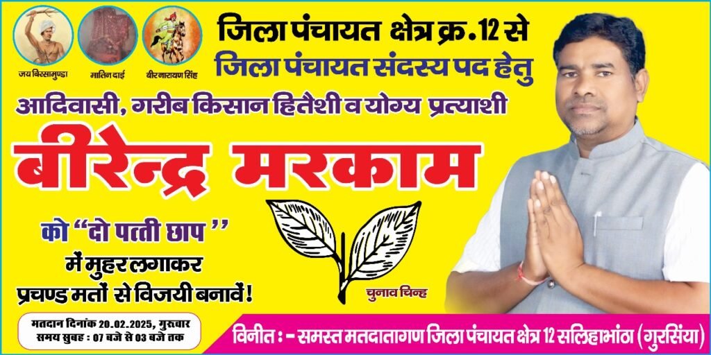 कोरबा:त्रिस्तरीय पंचायत चुनाव 2025 में जिला पंचायत पोड़ी उपरोड़ा के क्षेत्र क्रमांक 12 से जिला पंचायत सदस्य पद हेतु लोकप्रिय प्रत्याशी वीरेंद्र कुमार मरकाम चुनावी मैदान में है। क्षेत्र की जनता का इनको भरपुर समर्थन है।जनता इनके कार्यो से भलीभांति अवगत है। जिला पंचायत क्षेत्र क्रमांक 12 से प्रत्याशी पवन कुमार, किरण मरकाम, छत्रपाल सिंह कंवर, राकेश कंवर, गणेश सिंह कंवर, राय सिंह मरकाम चुनावी मैदान में है।वही वीरेंद्र कुमार मरकाम का जनाधार भारी है।
