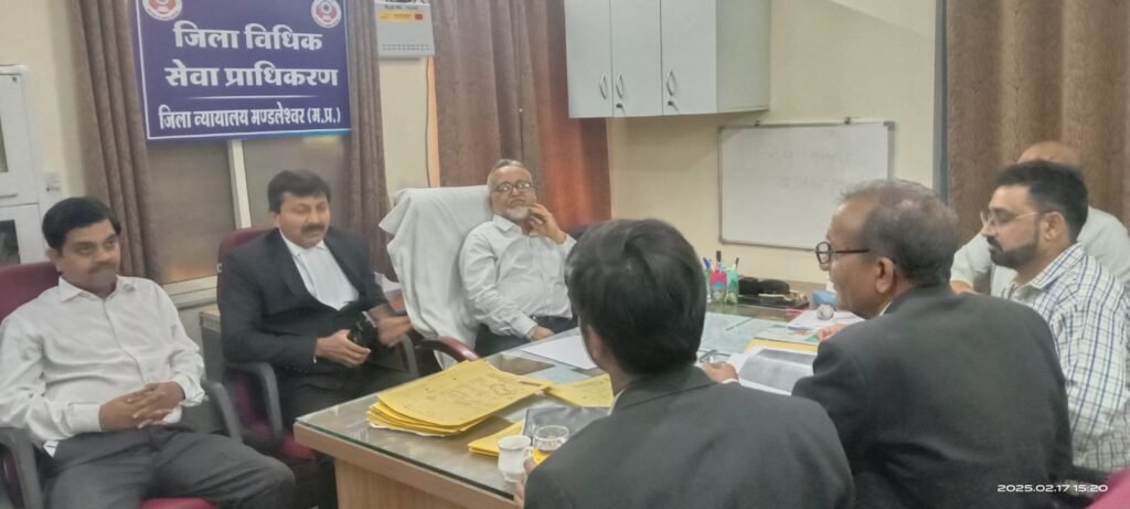 म.प्र. राज्य विधिक सेवा प्राधिकरण जबलपुर के तत्वाधान में 08 मार्च को नेशनल लोक अदालत का आयोजन हो रहा है। अदालत में क्लेम प्रकरणों के निराकरण के लिए प्रधान जिला न्यायाधीश एवं अध्यक्ष जिला विधिक सेवा प्राधिकरण मण्डलेश्वर के मार्गदर्शन में विषेश न्यायाधीश एवं नेशनल लोक अदालत प्रभारी मोहम्मद मूसा खान जिला न्यायाधीश मसूद एहमद खान एवं जिला न्यायाधीश भगवानदास राठौर द्वारा एडीआर सेंटर मण्डलेश्वर में नेशनल बीमा कंपनी के अधिकारी केतन जैन, कृष्णा कुमार यादव एवं बीमा कंपनी के अधिवक्ताओं के साथ प्री-सिटिंग बैठक संपन्न हुई।