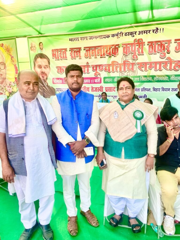 आज दिनांक 17/02/2025 को सीतामढ़ी जिला अंतर्गत सोनबरसा श्री नंदीपत जीतू हाई स्कूल के मैदान में भारत रत्न जननायक कर्पूरी ठाकुर के 37 वां पुण्यतिथि मुख्य अतिथि नेता प्रतिपक्ष श्री तेजस्वी यादव जी द्वारा राष्ट्रीय जनता दल के राष्ट्रीय वरिष्ठ नेता और प्रदेश के सभी प्रदेश अध्यक्ष एवं सभी प्रदेश राष्ट्रीय जनता दल के पदाधिकारी गण और सभी बिहार के विभिन्न जिलों से आए हुए वरिष्ठ नेता राष्ट्रीय जनता दल के पूरे बिहार के सभी सम्मानित कार्यकर्ता जननायक ठाकुर की इस पुण्यतिथि पर मैं चन्दन सहनी पूर्व जिला अध्यक्ष साह प्रदेश महासचिव अति पिछड़ा प्रकोष्ठ मैं उनको श्रद्धांजलि अर्पित करता हूं सत सत नमन करता हूं कर्पूरी ठाकुर अमर रहे कर्पूरी तेरे अरमानों को हम दिल्ली तक ले जाएंगे