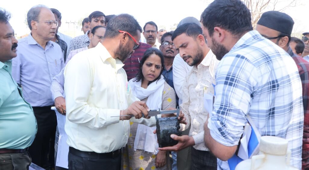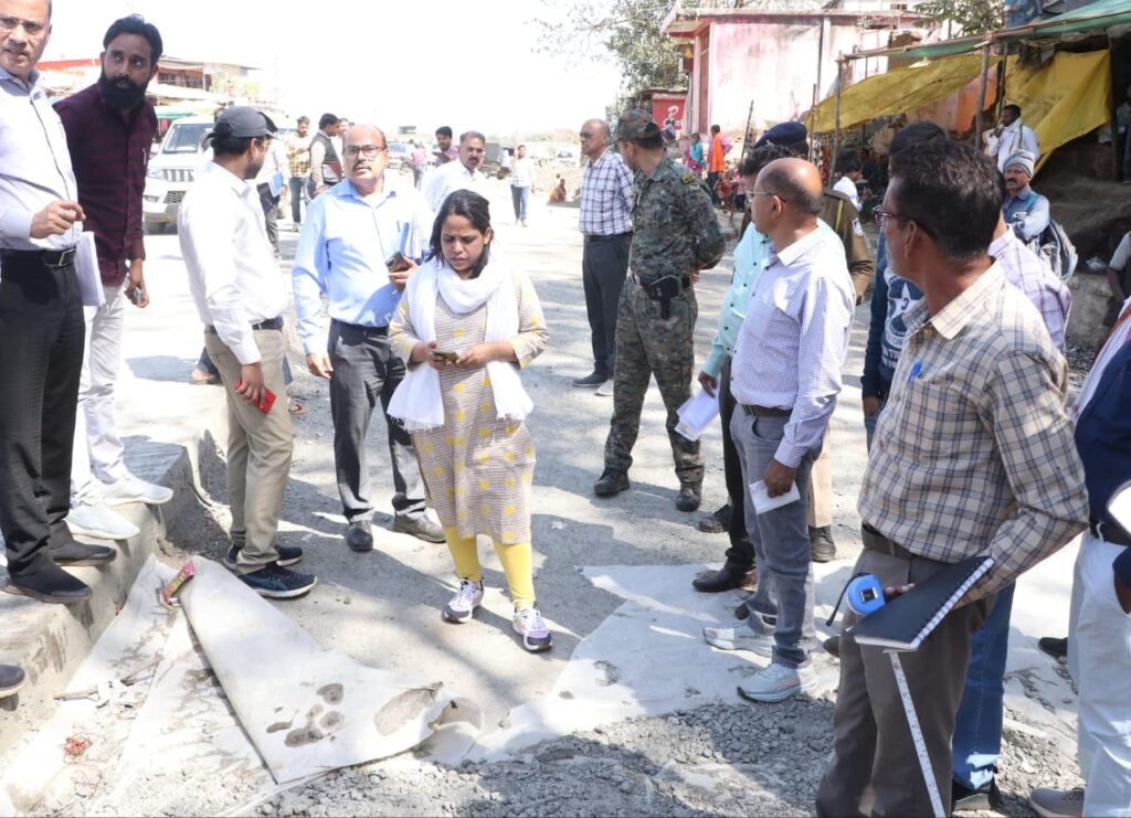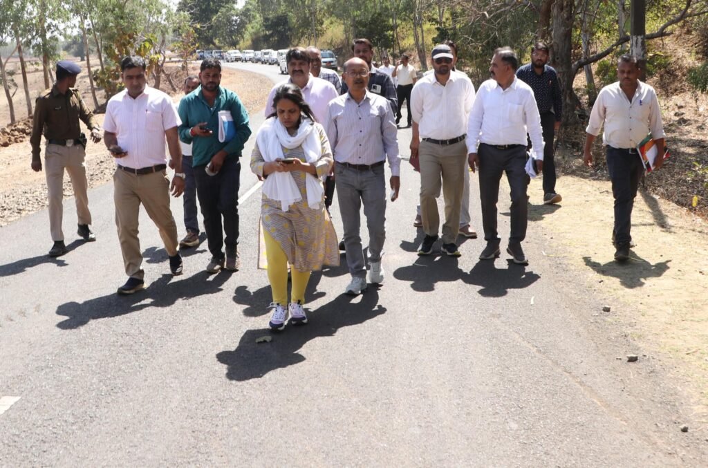 कलेक्टर श्रीमती नेहा मारव्या ने निरीक्षण के दौरान स्वीकृत टेंडर, लेआउट डिजाइन,ड्राइंग डिजाइन, यूटिलिटी स्पेस सड़क निर्माण मटेरियल, मानक स्तर पर सड़क की चौड़ाई एवं मोटाई, ड्रेनज व्यवस्था, स्लोप स्थिति, भूअर्जन सहित अन्य मुद्दों पर उपस्थित अधिकारियों से जानकारी लेकर मौके पर निर्माण कार्य का निरीक्षण किया।