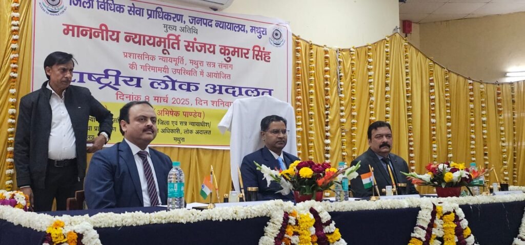 मथुरा। शनिवार को जनपद न्यायालय, मथुरा में राष्ट्रीय लोक अदालत का आयोजन किया गया, जिथुरा में राष्ट्रीय लोक अदालत का आयोजन किया गया, जिसमें 2,52,514 वादों का निस्तारण किया गया। इस अवसर पर माननीय उच्च न्यायालय इलाहाबाद के न्यायमूर्ति श्री संजय कुमार सिंह, प्रशासनिक न्यायमूर्ति, मथुरा की गरिमामयी उपस्थिति रही। लोक अदालत का शुभारंभ उन्होंने माँ सरस्वती के चित्र पर माल्यार्पण व दीप प्रज्वलन कर किया।