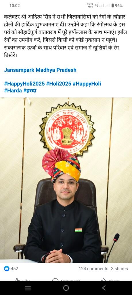 हरदा जिले के कलेक्टर आदित्य सिंह ने हरदा वासियों को होली पर्व की हार्दिक बधाई दी है और साथ ही कहा है कि ये त्योहार हरदा की जनता के लिए सुख और समृद्धि लेकर आए।।
