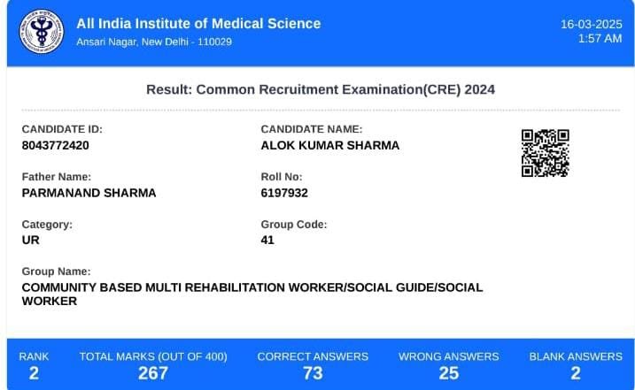 रायगढ़ :- छत्तीसगढ़ के रायगढ़ जिले के आलोक कुमार शर्मा ने देशभर में आयोजित AIIMS की CRE परीक्षा में दूसरा स्थान हासिल किया है,