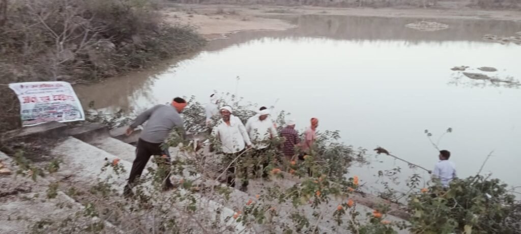 देवडोंगरा के डबरी तालाब के आस-पास लगी हुई झाड़ियों और कचरे की ग्रामवासियों के सहयोग से साफ- सफाई जारी