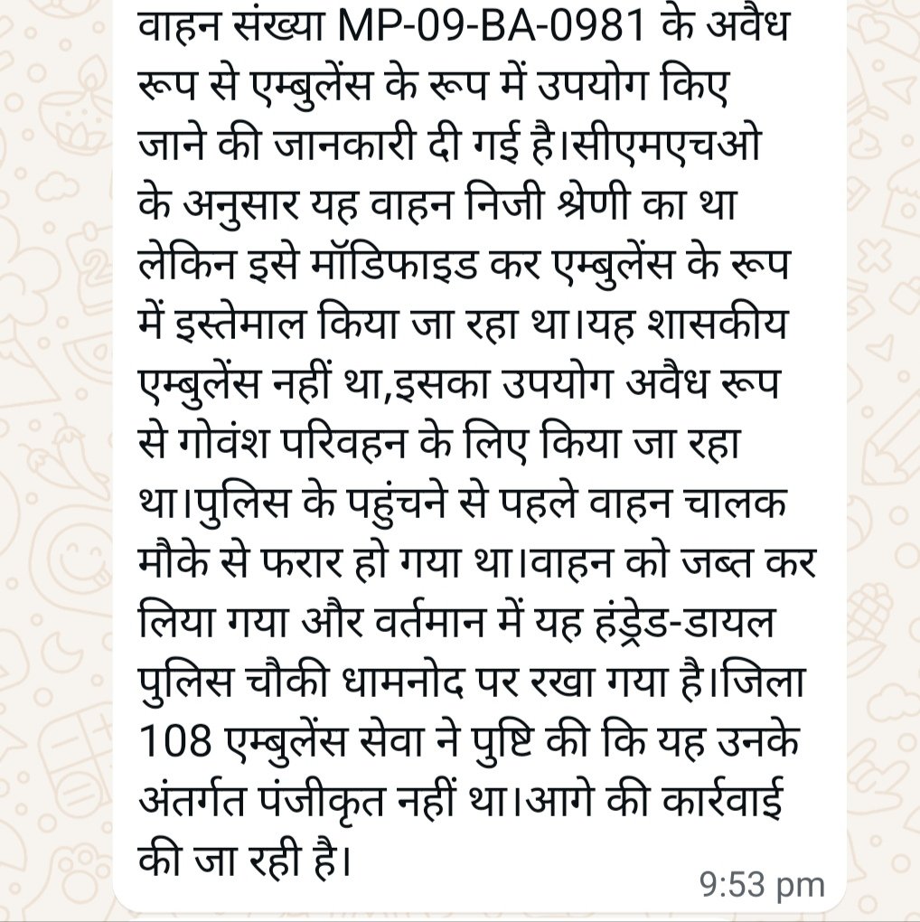 गोवंश तस्करी होने की संभावना धामनोद पुलिस जुटीं जांच मे
