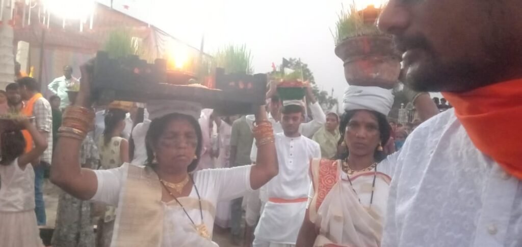 कोरबा:_कटघोरा ब्लॉक अंतर्गत ग्राम पंचायत जेवाली में माता सेवा समिति के सेवकगण, ग्राम सरपंच व पंचों की उपस्थिति में चैत्र नवरात्रि पर्व के अंतिम दिवस पूरे साजो सज्जा के साथ ग्राम के बैंगीन बैगा,रात दिन सेवा करने वाले सेवकों में फैशन विनीत विजयपुरिया रामकुमार अंजलि सोनिया स्नेहा दल के द्वारा मांदर धुनों के साथ ग्राम के बार देवली से भक्तगण ठाकुर देव चौक व समस्त देवी देवताओं का आह्वान करके नाचते झूमते लाया गया।