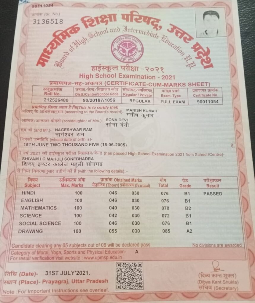 हाई स्कूल रोल नंबर-(212526480) पॉलिटेक्निक का रोल नंबर -(2429733436057)