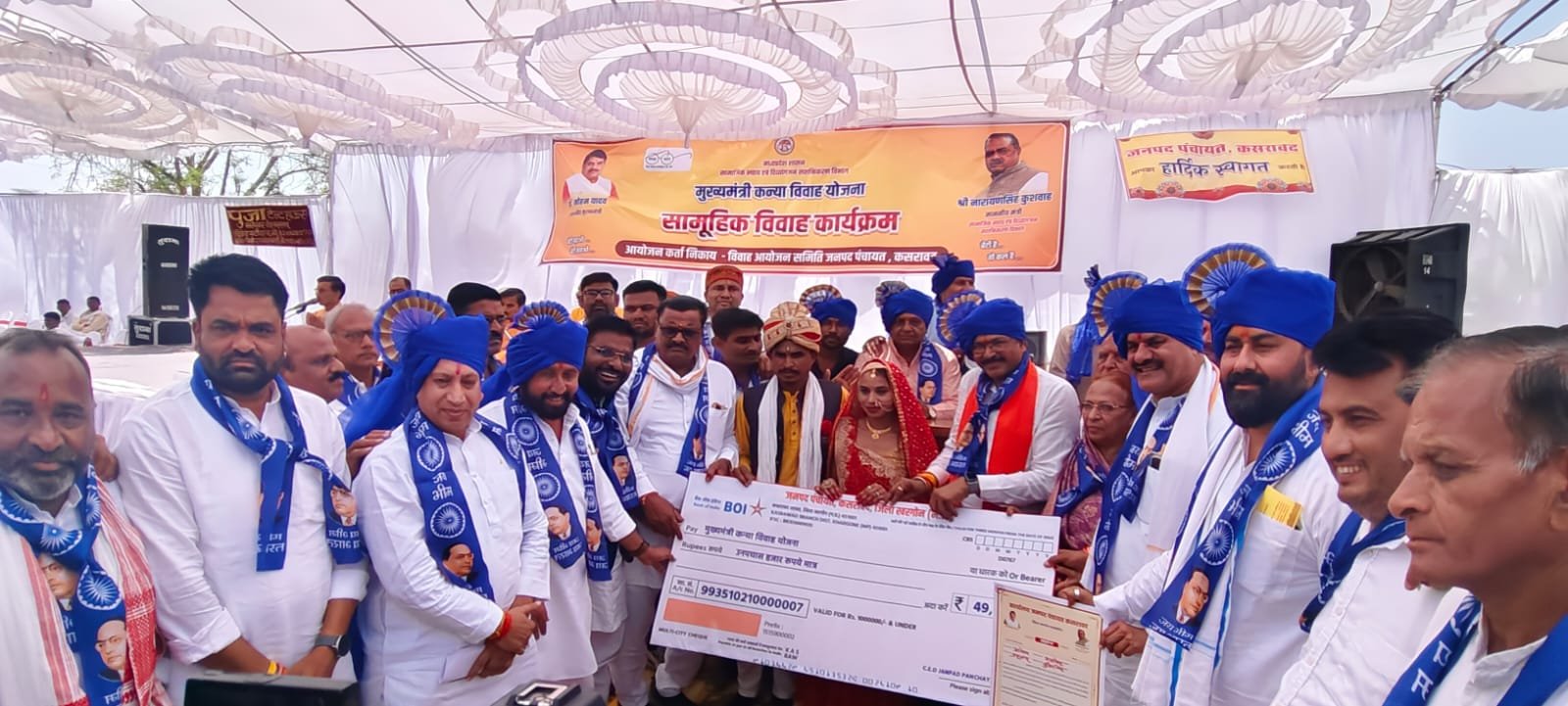 14 अप्रैल को डॉ. भीमराव अम्बेडकर जंयती पर जनपद पंचायत कसरावद अंतर्गत कृषि उपज मंडी कसरावद में मुख्यमंत्री कन्या विवाह योजना अंतर्गत 201 जोडो विवाह सम्पन्न हुआ। मुख्यमंत्री कन्या विवाह अन्तर्गत वधु के खाते मे शासन द्वारा 49000 की राशि भुगतान की जायेगी। इस अवसर परवर वधु को आशीर्वाद प्रदान करने लोकसभा क्षेत्र खरगोन बड़वानी के सांसद श्री गजेन्द्र पटेल, जिला पंचायत अध्यक्ष श्रीमती अनुबाई तंवर, कसरावद विधानसभा के विधायक श्री सचिन यादव, पूर्व विधायक श्री आत्माराम पटेल, जनपद अध्यक्ष श्रीमती सारिका राजेश बागदरे, जिला पंचायत अध्यक्ष प्रतिनिधि श्री बंटी तवर, श्री राजेंद्र यादव नगर परिषद कसरावद अध्यक्ष प्रतिनिधि, श्री राजेंद्र यादव, अन्त्योदय समिति अध्यक्ष श्री दशरथ पटेल, श्री राजेश बागदरे जनपद पंचायत कसरावद अध्यक्ष प्रतिनिधि, लक्ष्मण पटेल जनपद उपाध्यक्ष प्रतिनिधि, श्री परशुराम यादव, पूर्व कृषि उपज मंडी अध्यक्ष मांगीलाल गाडगें, पूर्व जनपद अध्यक्ष प्रतिनिधि श्री इंदर सिंह राठोर, जनपद सदस्य प्रतिनिधि मोतीराम वर्मा बोरावा, सुखलाल दामोदर सिपटान, संतोष मुलठान, श्री राजु पटेल नर्मदा पुत्र पार्षद प्रतिनिधि, श्री हेमन्त सोनी नगर परिषद एवं अन्य जनप्रतिनिधि तथा जनपद पंचायत कसरावद के अधिकारी कर्मचारी उपस्थित हुए। इस दौरान उन्होंने वर वधु को आशीर्वाद प्रदान किया एवं कन्या को 49000 खाते मे भुगतान के स्वीकृति पत्र एवं प्रतिक स्वरूप चेक प्रदाय किया गया एवं उनके उज्ज्वल भविष्य की कामना की गयी।