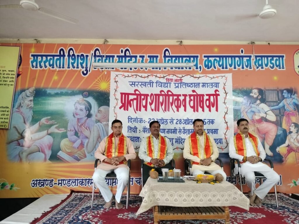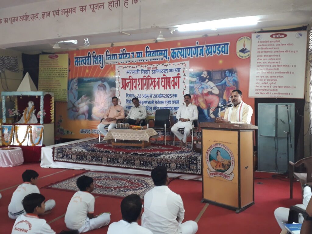 खण्डवा//विद्या भारती मालवा प्रांत के मार्गदर्शन में प्रांतीय शारीरिक एवं घोष वर्ग स्थानीय सरस्वती शिशु विद्या मंदिर कल्यानगंज खंडवा विद्यालय में दिनांक 22 से 28 अप्रैल तक 7 दिन का आयोजन चल रहा है जिसमें मालवा प्रांत के 7 विभाग जिसमे इंदौर, शाजापुर ग्राम भारती, मंदसौर, उज्जैन, खंडवा, खरगोन आदि से लगभग 130 की संख्या में भैया व शिक्षार्थी शारीरिक व घोष का अभ्यास करने आए हुए हैं इसमें शारीरिक अभ्यास वर्ग के अंतर्गत योगचाप, समता, सामूहिक समता, व्यायाम योग, संचलन अभ्यास की बारीकियां से अवगत होकर सीख रहे है इसी तरह घोष अभ्यास के अंतर्गत आनक, शंख, वेणु का अभ्यास कर रहे हैं।संचालित हो रहे इस वर्ग में बुधवार को प्रातःकालीन सत्र में प्रशिक्षार्थियों को खेल,साहसिक प्रदर्शन,नियुद्ध,योगासन का अभ्यास कराया गया।तत्पश्चात वर्ग के उद्घाटन सत्र में मालवा प्रान्त के प्रांतीय शारीरिक संयोजक तथा खरगोन विभाग के विभाग समन्वयक श्री महादेव जी यादव का सभी शिक्षार्थियों को पाथेय प्राप्त हुआ जिसमें उन्होंने वर्ग के महत्व पर प्रकाश डालते हुए बताया कि सामूहिक जीवन कैसे जीया जाता है यह वर्ग उसका अभ्यास है। जिनका अभ्यास अच्छा होता है उसे सफलता मिलती है और जिनका जितना अभ्यास उसमें उतनी गुणवत्ता आएगी।साथ ही यह भी कहा है कि यहाँ से सभी विधाएं सीखने के पश्चात अपने-अपने विद्यालयों में सिखाने की बात कही है।इस अवसर पर विद्यालय समिति के सचिव श्री रविन्द्र जी बंसल,कोषाध्यक्ष श्री ओम जी दशोरे श्री जितेंद्र जी महाजन वर्ग संयोजक सहित श्री भगवान जी पाटिल वर्ग संचालन टोली व शिक्षक टोली उपस्थित रहे।