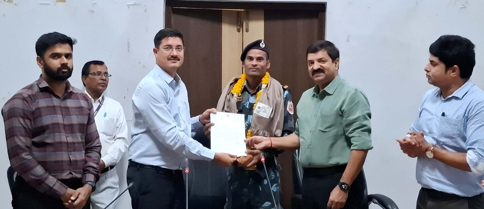 कलेक्टर श्री गुप्ता ने एस.डी.ई.आर.एफ के जवान श्री प्रकाश पांचोरे को किया सम्मानित