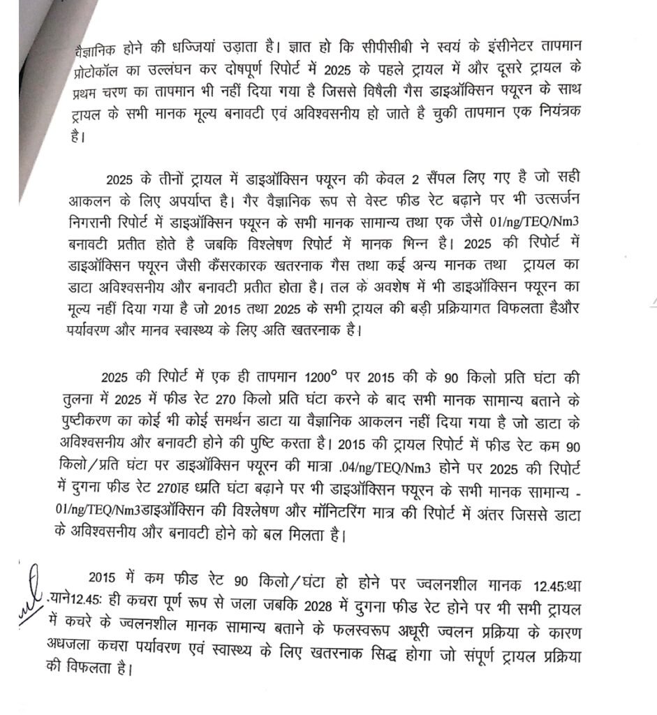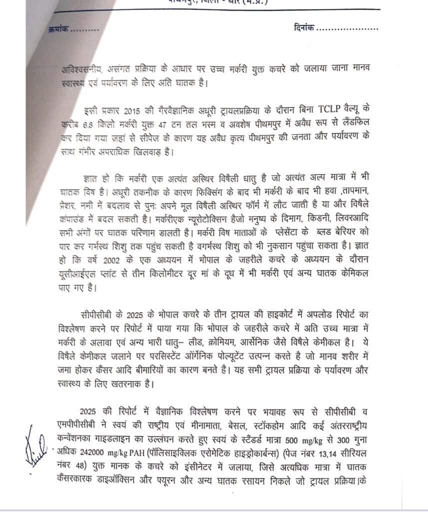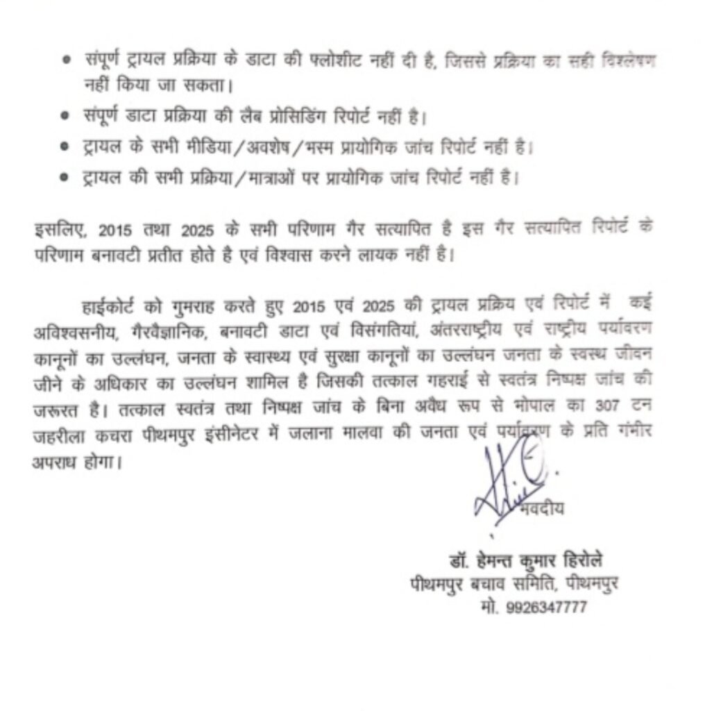 पीथमपुर बचाओ  समिति के अध्यक्ष डॉ हेमंत  हिरोले  ने प्रेस विज्ञप्ति जारी कर   इंदौर संभाग  के  कमिश्नर एवं जिला कलेक्टर धर 1  माई से यूनियन कार्बाइड कचरे के  जलने की प्रक्रिया पर रोक लगाने की मांग की हैै और इन सभी बिंदुओं की जानकारी    सत्यापित कापी सार्वजनिक  क्यों नहीं की  गई है     आखिर इसका दोषी कौन जांच कर दोषियों के ऊपर कार्यवाही करते हुए सत्यापित काापी सार्वजनिक किए जाएं  की मांग है l
