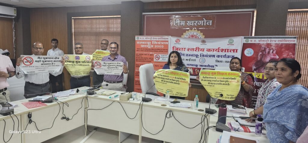 कलेक्टर श्रीमती भव्या मित्तल की अध्यक्षता में 05 मई को जिला स्तरीय समन्वय समिति की बैठक एवं कार्यशाला का आयोजन कलेक्टर परिसर के सभागार में किया गया। कार्यशाला के दौरान श्री आनन्द वर्मा (परियोजना समन्वयक), मध्य प्रदेश वोलंटरी हेल्थ एसोसिएशन ने कहा कि भारत में प्रतिवर्ष 13 से 14 लाख लोगों की मृत्यु तंबाकू सेवन से होने वाली बीमारियों के कारण होती है।