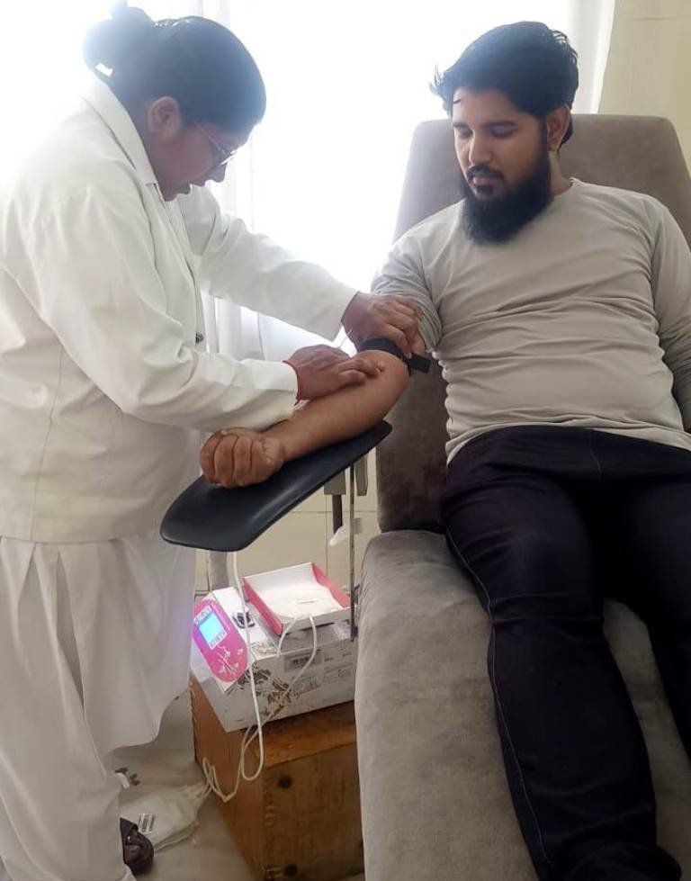 खण्डवा//कलेक्टर श्री ऋषव गुप्ता व रेड क्रॉस सोसाइटी के अध्यक्ष के निर्देशन में विश्व रेडक्रॉस सोसाइटी के जनक सर हेनरी के जन्म दिवस के अवसर पर नशा मुक्ति के तहत जन जागरूकता कार्यक्रम का आयोजन किया गया। कार्यक्रम के नोडल अधिकारी डॉ. सुजीत वर्मा द्वारा तंबाकू एवं अन्य तंबाकू उत्पादों से स्वास्थ्य पर होने वाले दुष्प्रभाव की जानकारी दी गई। डॉ. नेहा शुक्ला दंत चिकित्सक द्वारा मरीजों का स्वास्थ्य परीक्षण कर उन्हें आवश्यक दवाइयां एवं परामर्श दिया गया। इसी कड़ी में ब्लड बैंक जिला चिकित्सालय खंडवा में स्वैच्छिक रक्तदान शिविर का आयोजन किया गया, जिसमें 22 आम नागरिकों द्वारा स्वैच्छिक रक्तदान किया गया। सिविल सर्जन डॉ. अनिरुद्ध कौशल द्वारा कहा गया कि रक्तदान महादान है, इससे हम लोगों की जान बचा सकते हैं। इसलिए हमें इस पुनीत कार्य के लिए दूसरों को प्रेरित करना चाहिए। उनके द्वारा यह भी कहा गया कि आमतौर पर लोग रक्तदान करने से डरते हैं, क्योंकि उनको लगता है कि शरीर कमजोर हो जाएगा, यह सब भ्रांतियां हैं। हर स्वस्थ व्यक्ति 3 माह में स्वैच्छिक रक्तदान कर सकता है। थैलेसीमिया की बीमारी, जो कि एक अनुवांशिक बीमारी है, एक पीढ़ी से दूसरी पीढ़ी में प्रवाहित होती है। इसमें कमजोरी, थकान, पीलापन एवं शरीर का विकास धीमी गति से होता है और बार-बार खून की कमी होने के कारण खून चढ़ाना पड़ता हैै। श्री