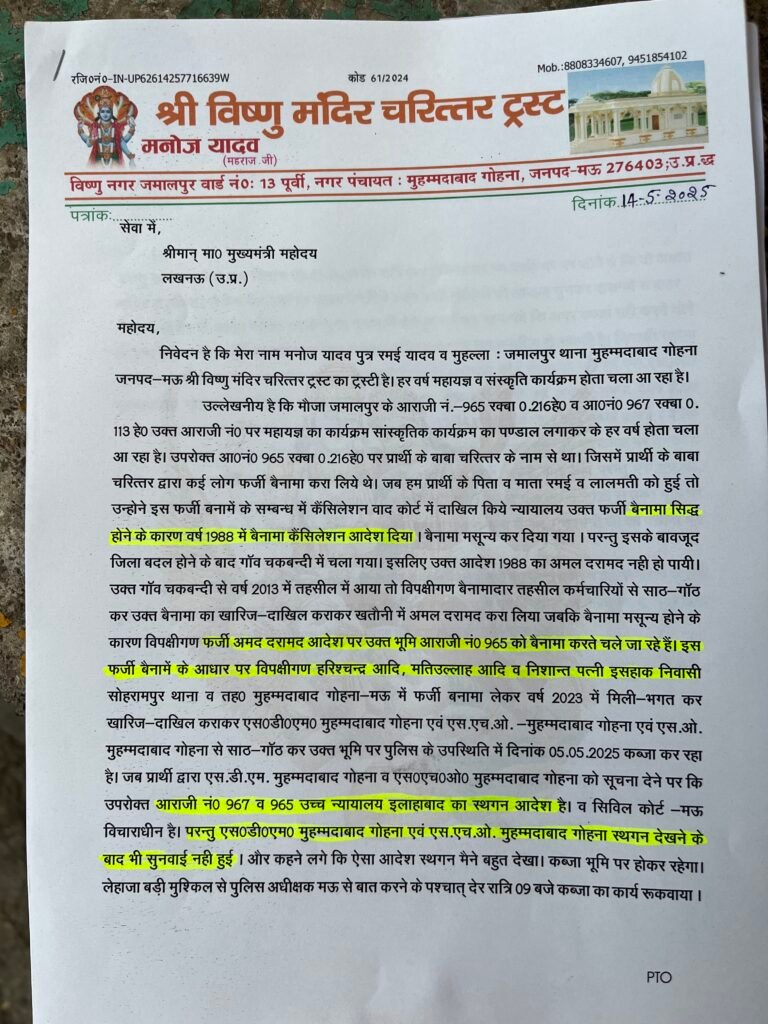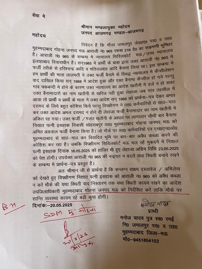 पुरा आरोप लगाया कि मनोज यादव के पास कोई पेपर नहीं है लेकिन दिनांक 16/07/2025 को न्यायालय मे निशान पत्नी इशहाक हाजिर है। परन्तु सत्य को छिपाकर क़ब्ज़ा करना चाहते है। अग्रिम कार्यवाही दिनांक 23/05/2025 को सुनवाई होगी।