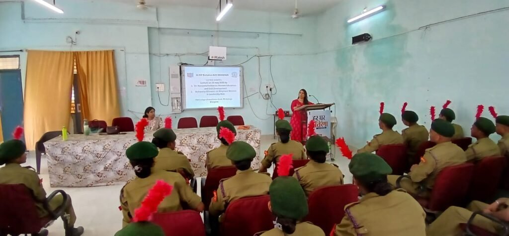 इस दौरान विषय विशेषज्ञ सुश्री ऐश्वर्या दिलावरे ने नेतृत्वकारी भूमिकाओं में महिलाओं को सशक्त बनाना” विषय पर अपने विचार साझा करते हुए कहा कि आज का युग महिलाओं के नेतृत्व को सम्मान देने और उन्हें निर्णयात्मक भूमिकाओं में स्थान देने का है। उन्होंने बताया कि नेतृत्व केवल पद या अधिकार नहीं होता, बल्कि यह दृष्टिकोण, सोच और निर्णय क्षमता का प्रतिबिंब होता है। सुश्री दिलावरे ने इतिहास और समकालीन समाज से उदाहरण प्रस्तुत करते हुए बताया कि कैसे महिलाएं शिक्षा, प्रशासन, विज्ञान, राजनीति और उद्यमिता जैसे विविध क्षेत्रों में अग्रणी भूमिका निभा रही हैं। उन्होंने यह भी रेखांकित किया कि महिलाओं को नेतृत्व में आगे लाने हेतु शिक्षा, सामाजिक स्वीकृति, संस्थागत समर्थन और आत्मबल आवश्यक हैं। उन्होंने उपस्थित कैडेट्स को प्रेरित करते हुए कहा कि जब युवा महिलाएं नेतृत्व की ओर कदम बढ़ाती हैं, तो वे समाज में सकारात्मक बदलाव लाने वाली शक्तिशाली प्रेरणा बनती हैं।