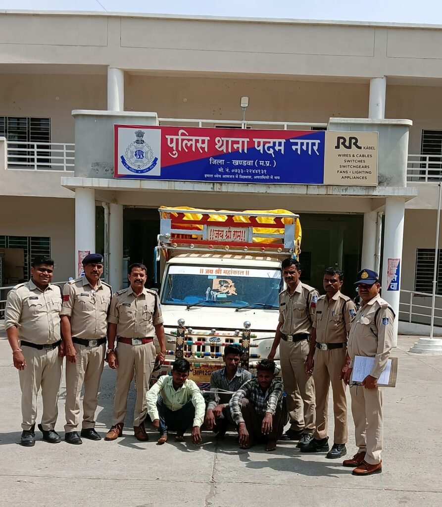 उक्त तारतम्य में दिनांक 09.06.2025 कि रात्री को पुलिस को मुखबीर द्वारा सूचना मिली की तीन व्यक्ति उक्त चोरी गया सोयाबीन एवं गेहुँ बेचने के लिए नई अनाज मंडी में ला रहे है। उक्त सूचना पर विश्वास कर टीम को लगाया गया मुखबिर की सूचना पर पीक अप वाहन क्र. MP 12 GA 1928 में सवार तीन संदेही से पुछताछ की जिन्होने अपना नाम 01. रमेश उर्फ रेहमा पिता गंजा भुरिया जाति बील उम्र 23 वर्ष निवासी ग्राम खामला थाना निम्बोला जिला बुरहानपुर 02. सुनील पिता जीतु मुजाल्दे जाति बारेला उम्र 30 वर्ष निवासी टेमीकला निसानिया फाल्या थाना छैगाँवमाखन जिला खण्डवा 03. गुड्डा उर्फ गुडिया पिता तेरसिंह मुजालदे जाति बारेला उम्र 38 वर्ष निवासी टेमीकला निसानिया फाल्या थाना छैगावमाखन जिला खण्डवा का रहना बताया जिनसे उक्त अपराध के बारे में पुछताछ करते जिन्होने अपराध करना स्वीकार किया बाद उक्त वाहन एवं 28 कट्टे सोयाबीन एवं गेहुँ जप्त कर आरोपीयो को गिरफ्तार कर थाना लाए ।