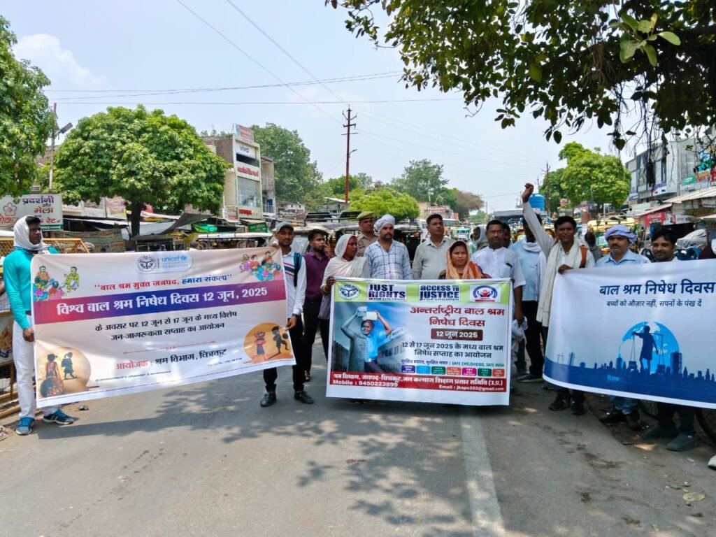 *आज दिनांक* 12/06/2025 को श्रम विभाग के तरफ से बाल श्रम निषेध दिवस के उपलक्ष्य में जागरूकता को लेकर पद यात्रा श्रम विभाग से होते हुए धनुष चौराहा एवं कर्वी थाना कोतवाली से लेकर पुरानी बाजार तक यात्रा निकला गया जिसमें श्रम विभाग के अधिकारी श्री महेंद्र शुक्ला जी एवं श्रम विभाग के सभी साथी और कर्वी थाना A H T U से S I सदानंद जी , बाल संरक्षण अधिकारी सौरभ सिंह , चाइल्ड लाइन से विशेष त्रिपाठी , जन शिक्षण संस्थान से दयाशंकर पायासी CWC से अध्यक्ष राकेश माथुर जी और जन साहस टीम MRC से RCF सोनू जी, FO दीपक जी एवं हरीश जी और PVAWC टीम से डीसी शिवकुमार जी ,केस वर्कर मनोज जी एवं काउंसलर शांति जी , प्रिवेंशनिस्ट सावित्री जी शामिल रही । इसके बाद कर्वी ब्लॉक के कोलगदहिया गांव में बाल श्रम निषेध दिवस कार्यक्रम का आयोजन किया गया जिसमें सोनू जी के द्वारा बाल श्रम मजदूरी के बारे में जानकारी दी गई और उनके बाल अधिकारों के बारे में जानकारी दी गई और उनकी शिक्षा को लेकर चर्चा की गई और गुड टच बैंड तक के बारे में बच्चियों को जानकारी दी गई और सरकार द्वारा चल रही योजनाओं के बारे में उनके परिवार को जानकारी दी गई और इसके बाद सभी साथियों के चार्ट पेपर में पेंटिंग प्रतियोगिता का कार्य किया है और इसके FO साथी के द्वारा बच्चों सरकारी हेल्पलाइन और जन साहस मजदूर हेल्पलाइन और महिला हेल्पलाइन के बारे में जानकारी दी गई । और कार्यक्रम के दौरान टोटल 35 साथियों की उपस्थिति रही ।